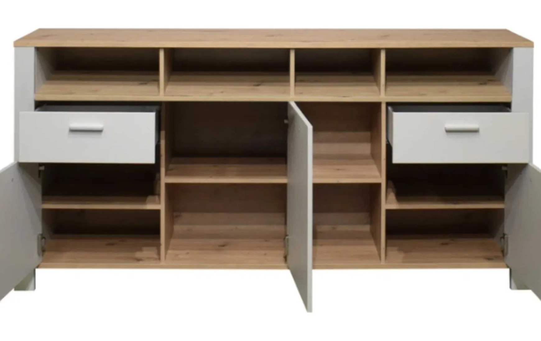 Dieses Sideboard verfügt über viel Stauraum: Hinter 2 Schubladen, 3 Türen und 6 offenen Fächern verbirgt sich ausreichend verdeckter sowie offener Stauraum. Gefertigt mit einem spannenden Farbmix aus Kreidegrau und Asteiche passt das Sideboard perfekt zum Landhauslook.
