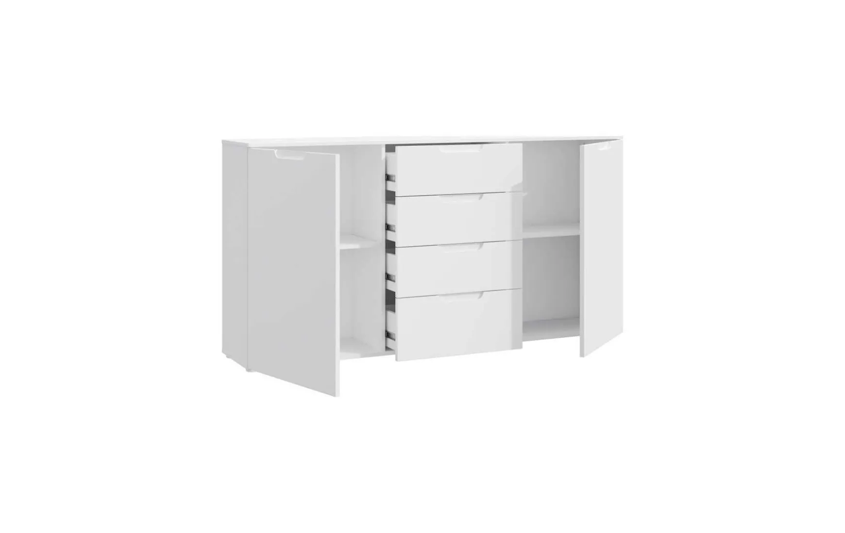 Durch das moderne Design in Weiß Hochglanz bringt diese Kommode viel Helligkeit in jeden Raum. Hinter den großen Türen verbergen sich insgesamt 4 geräumige Fächer, welche zusammen mit den 4 Schubladen, sehr viel Stauraum bieten.