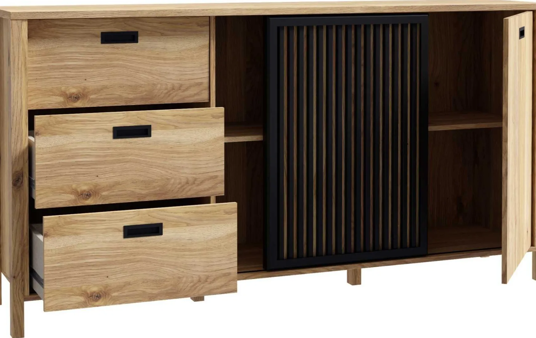 Richtig schick sieht das Sideboard aber auch aus, denn die Beschichtung in naturnaher Mauvella Eiche Nachbildung und Schwarz machen einen ober coolen Eindruck. Die Vielfalt der Türen und Schubladen wird Sie begeistern, denn nun ist Ordnunghalten für Sie kein Problem mehr. Auf jeden Fall wird das Stauraumwunder Ihnen im Wohnzimmer oder an jeder anderen Wand im Raum viel Spaß bereiten.