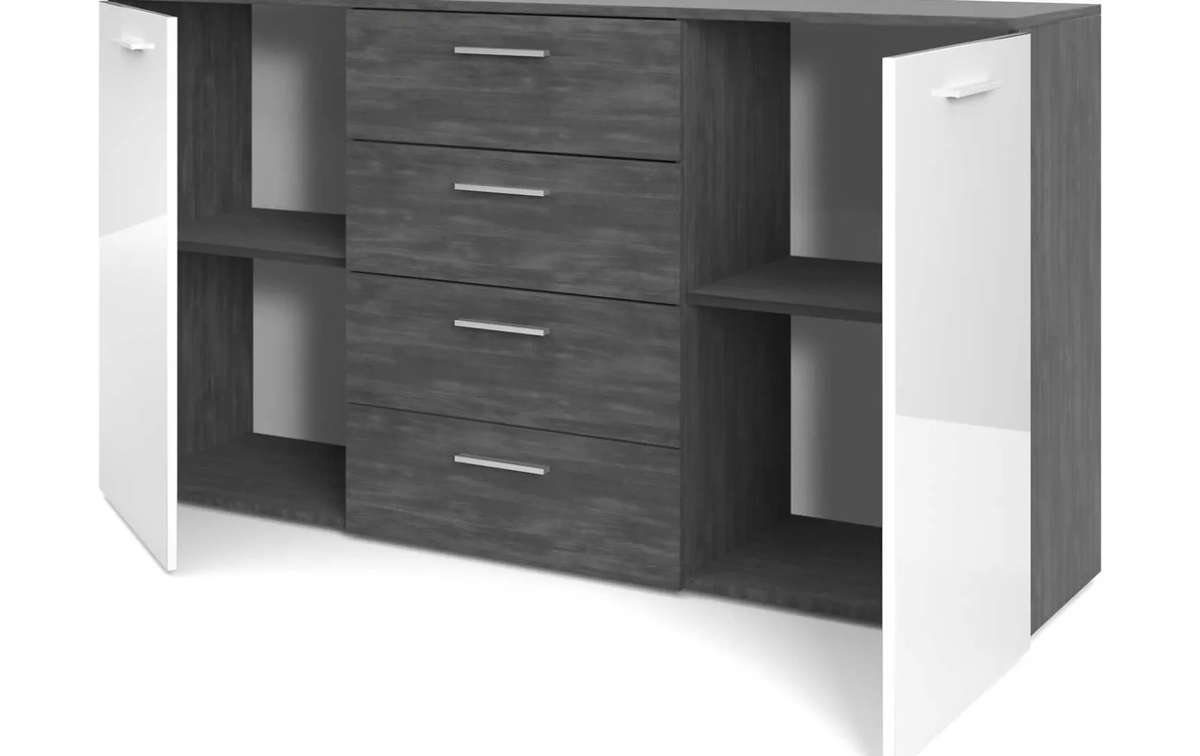 Dieses moderne Sideboard überzeugt mit klarer Linienführung und durchdachter Funktionalität. Mit zwei Türen und vier geräumigen Schubkästen bietet es viel Stauraum für Geschirr, Unterlagen oder Wohnaccessoires. Der schwarze Korpus in „Black North“ bildet einen eleganten Kontrast zu den weißen Hochglanz-Fronten aus MDF und verleiht dem Möbelstück eine zeitgemäße, hochwertige Optik. Dank seiner kompakten Maße von ca. 160 × 83 × 38 cm passt das Sideboard ideal in Wohn- oder Essbereiche und wird zerlegt zur einfachen Selbstmontage geliefert.