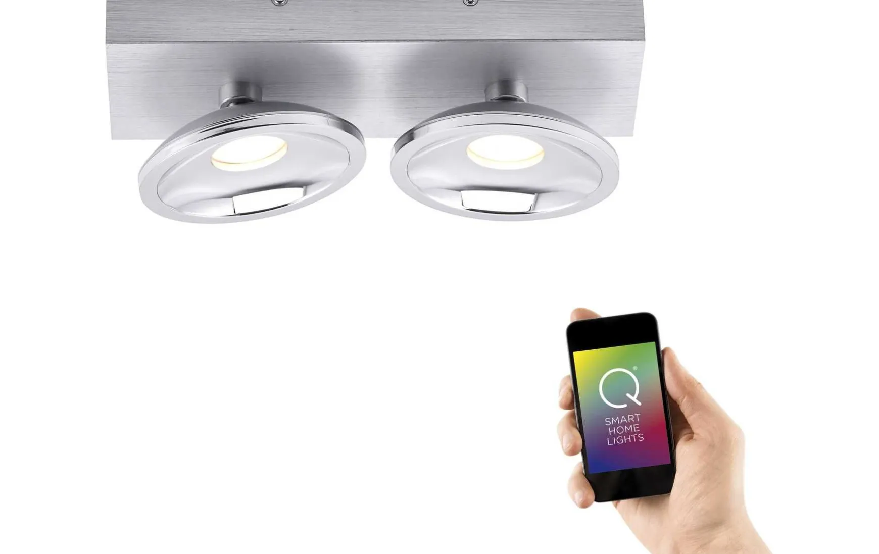 Q-Deckenleuchte aluminium 2flg., RGB schaltbar per Funkfernbedienung oder APP; Kopf inkl. Kugelgelenk daher schwenkbar, Länge 28cm, Breite 12cm, Höhe 11cm, inkl. 2x LED Board 5Watt, 450Lumen, 3000 Kelvin, enthält LM der Energieeffizienzklasse A+, LM nicht wechselbar