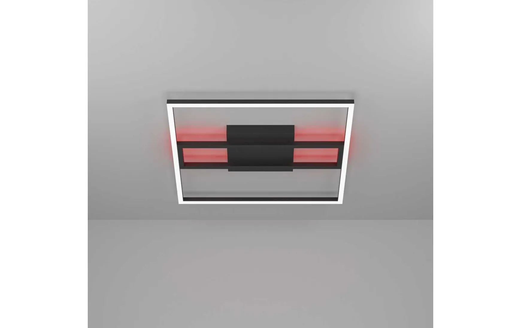 Die LED Deckenleuchte ist aus einem quadratischen, schwarzen Metall-Rahmen mit integrierten Leuchtelementen