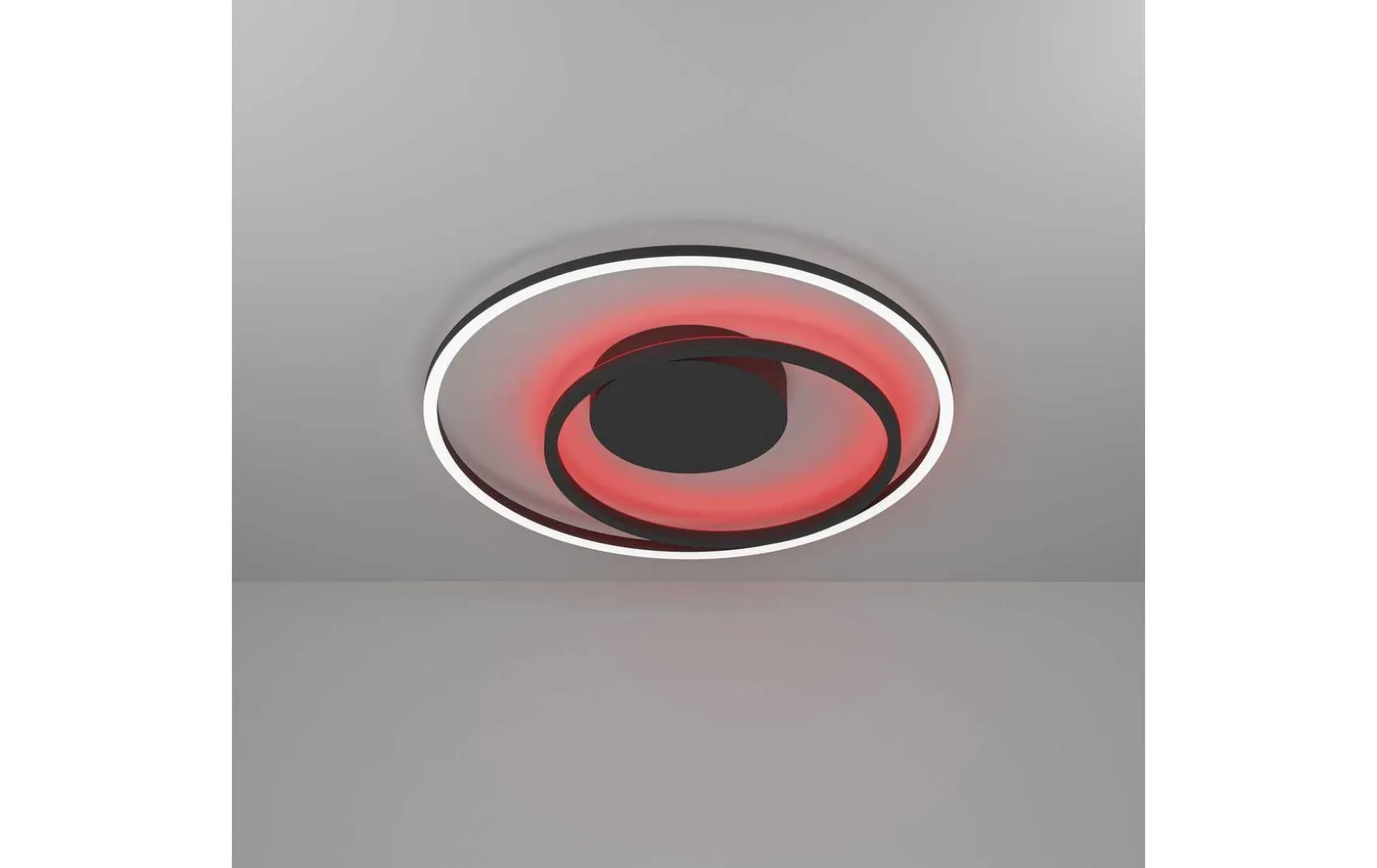 Die LED Deckenleuchte ist aus einem runden, schwarzen Metall-Rahmen mit integrierten Leuchtelementen