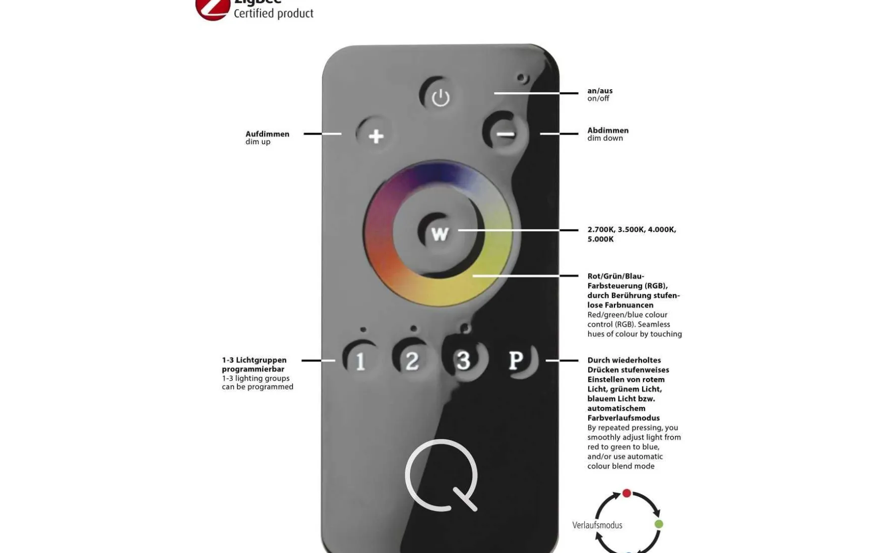 Diese Regulierung erfolgt über die Q®-Fernbedienung, die bei jeder Q®-Leuchte im Lieferumfang enthalten ist.
