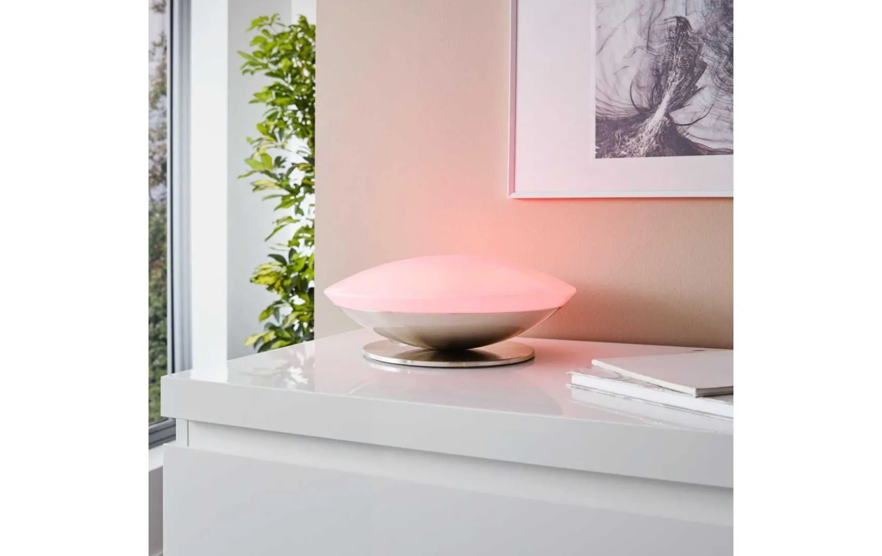 Diese LED Tischleuchte besteht aus einem Metall-Fuß in Nickel-Matt und einem abgerundeten, flachen Leuchtenkopf aus weißem Kunststoff. Im unteren Bereich besteht der Kopf aus einem nickel-matten Metall-Element, in dem die LEDs integriert wurden. Diese spenden angenehmes Licht ganz nach Ihren Wünschen. Sie haben die Wahl zwischen warmweißem, neutralweißem und kaltweißem Licht und einer Vielzahl an RGB Lichtfarben. Die Steuerung der Leuchte erfolgt via kostenloser App und ermöglicht Ihnen den Zugriff auf weitere Komfortfunktionen wie Dimmen, Timer, Anwesenheitssimulation und vielen mehr. Zusätzlich lässt sich die smarte Tischlampe auch über die separat erhältliche Fernbedienung steuern, ein problemloses Ein- und Ausschalten ist zudem über einen Schalter am Kabel möglich. Sie fügt sich nahtlos in moderne Einrichtungsstile ein und bietet eine stimmungsvolle Beleuchtung für jeden Raum – egal ob im Schlafzimmer auf dem Nachttisch, Wohnzimmer, Esszimmer oder im Flur auf dem Sideboard.