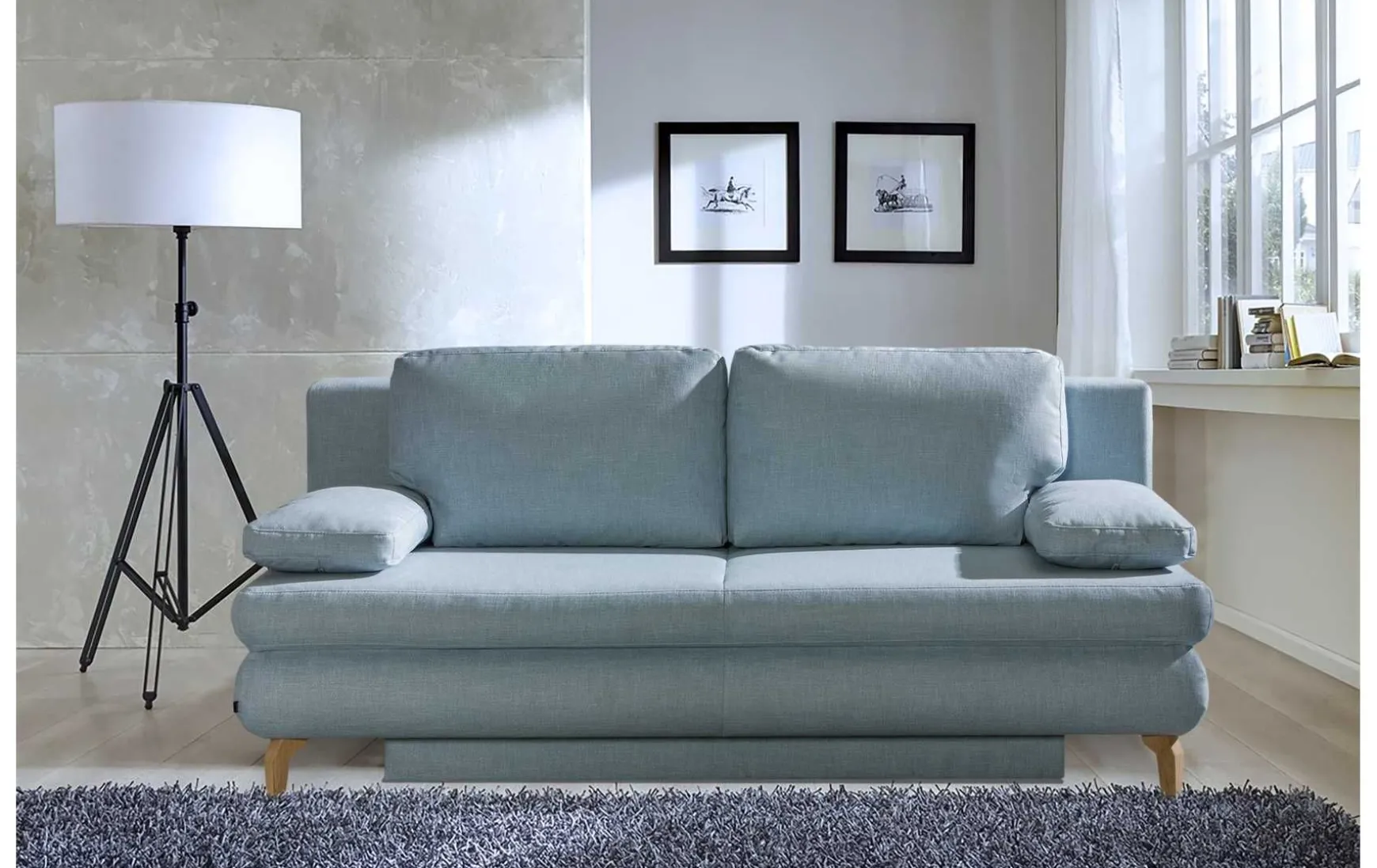 Dieses schicke Schlafsofa im hellen Blauton ist alles andere als ein gewöhnlicher 2-Sitzer. Mit einer integrierten Schlaffunktion und dem geräumigen Bettkasten unter der Sitzfläche könnte man dieses Modell auch als Raumwunder bezeichnen. Trotz der platzsparenden Größe haben Sie Dank der Funktionen sogar die Möglichkeit, sich auf spontane Übernachtungsgäste einzustellen. Dafür sorgt nicht nur die einfache Verwandlung vom 2-Sitzer zum Gästebett und die praktische Unterbringung von Decken sowie Kissen, sondern auch die komfortable Polsterung.