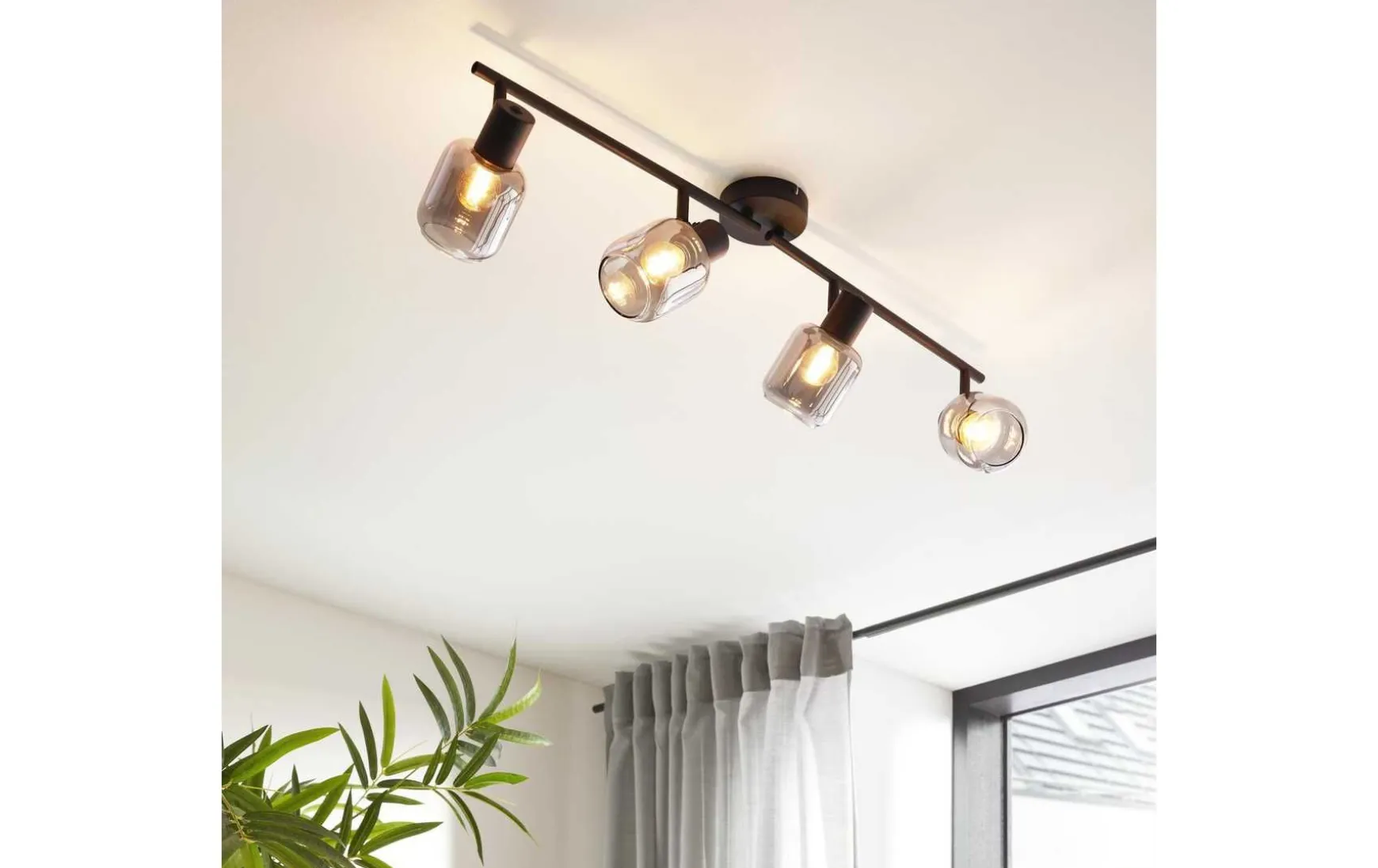 Die Deckenleuchte aus der Interliving Leuchten Serie 9341 kombiniert mattschwarzes Metall mit schwenkbaren Lampenschirmen aus verspiegeltem rauchfarbenen Glas. Durch die Materialien und Farben sowie die spezielle Formensprache verkörpert die Deckenlampe eine moderne Interpretation des angesagten Industriestils. Sie verleiht dem Raum das gewisse Etwas und sorgt natürlich auch für die gewünschte Helligkeit.