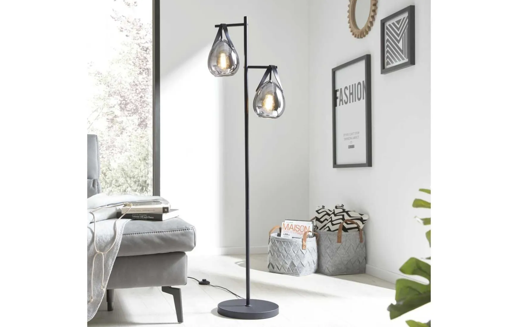 Diese Stehleuchte besteht aus einem klassisch mattschwarzen Metallgestell und zwei Lampenschirmen, die verspiegeltes rauchfarbenes Glas mit schwarzem Kunstleder verbinden. Durch die spezielle Materialkombination und Formensprache strahlt die Standlampe moderne Eleganz mit futuristischem Charme und einem Hauch Industriestil aus. Neben dem attraktiven Design überzeugen auch die praktischen Aspekte. Da die Stehlampe ohne Leuchtmittel geliefert wird, können Sie Letztere jederzeit austauschen, was sich positiv auf die Lebensdauer der gesamten Lampe auswirkt. Darüber hinaus haben Sie freie Wahl in Bezug auf die Energieeffizienzklasse. Sie benötigen zwei maximal 60 Watt starke Leuchtmittel mit E27-Sockel. Auf ca. 39 x 143 x 30 cm (BxHxT) belaufen sich die Maße der edlen Standleuchte. Dank der großzügigen Kabellänge von ca. 180 cm sind Sie hinsichtlich des Aufstellungsortes sehr flexibel. Die Lampe empfiehlt sich vor allem für das Wohn- oder Schlafzimmer. Mit dem Fußtritt-Schnurschalter am schwarzen Kabel lässt sie sich bequem ein- und ausschalten.