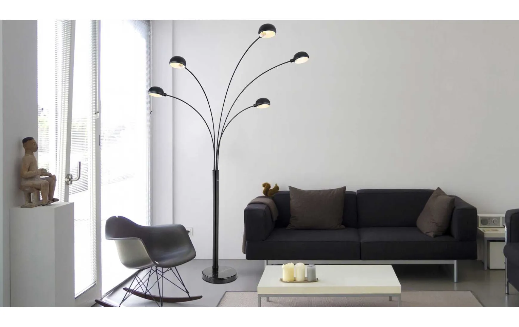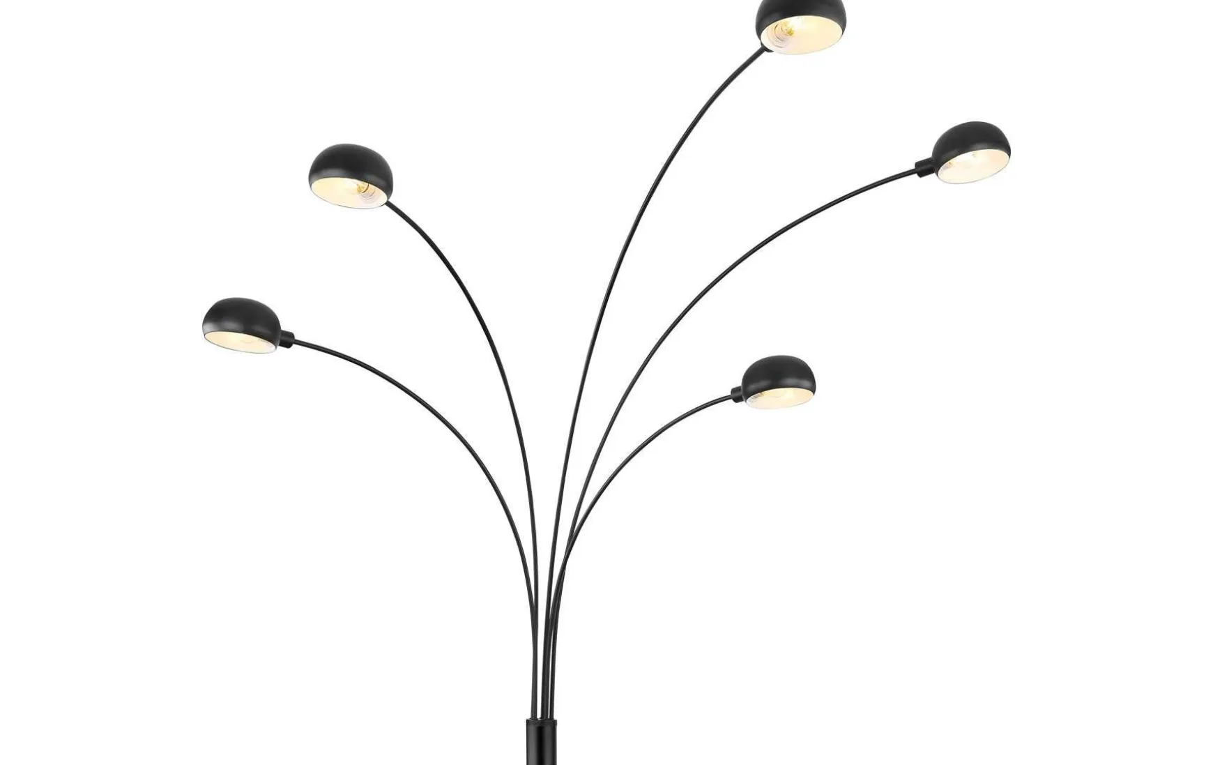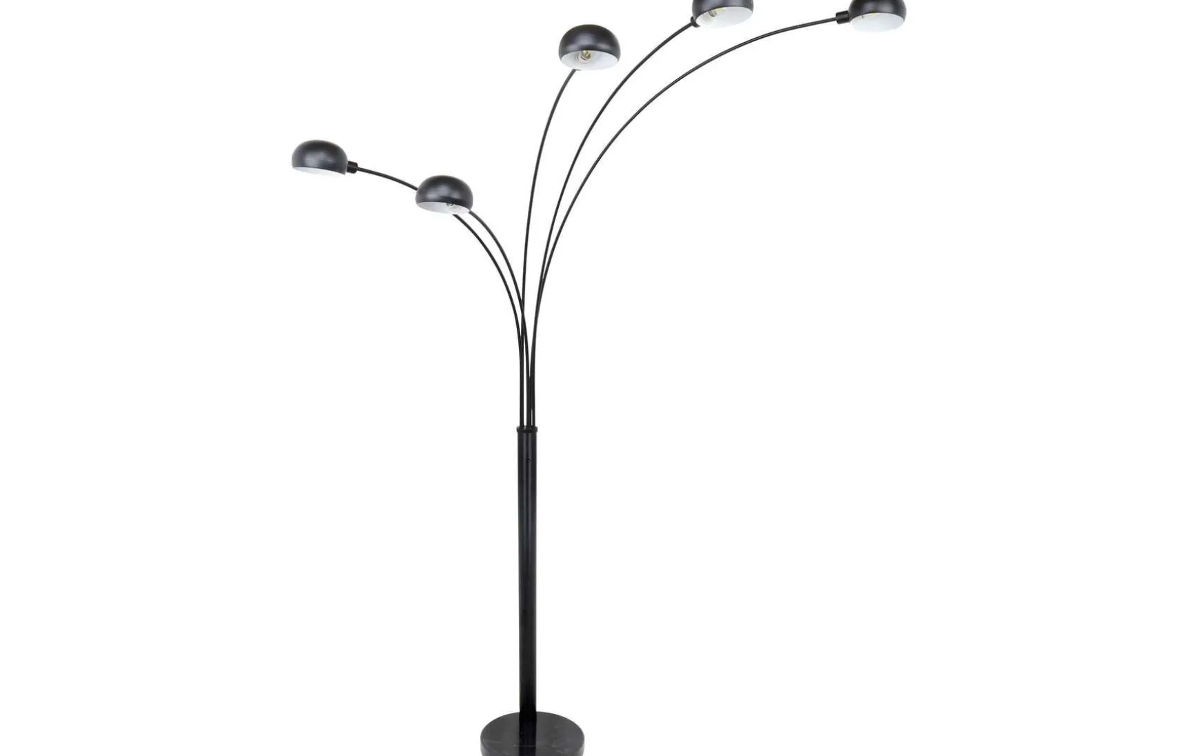 Diese Stehlampe aus der Seymour-Serie überzeugt durch ihr simples Design aus schwarzem Metall. Die 200 cm große Stehleuchte besteh aus einem runden Marmorsockel, auf dem ein Metallzylinder fixiert ist. Aus diesem ragen fünf gebogene Metallstäbe unterschiedlicher Länge, welche an den Enden mit runden Metallkuppeln mit jeweils fünf Linienstanzungen an der Rückseite versehen sind. Diese können mit E14-Leuchtmitteln Ihrer Wahl bestückt werden, wodurch Sie die Möglichkeit haben, Lichtfarbe und Helligkeit individuell zu bestimmen. Durch weitere Modelle der gleichen Serie können Sie das Gesamtbild in Ihren Innenräumen komplettieren und für ein stilvolles Ambiente sorgen.