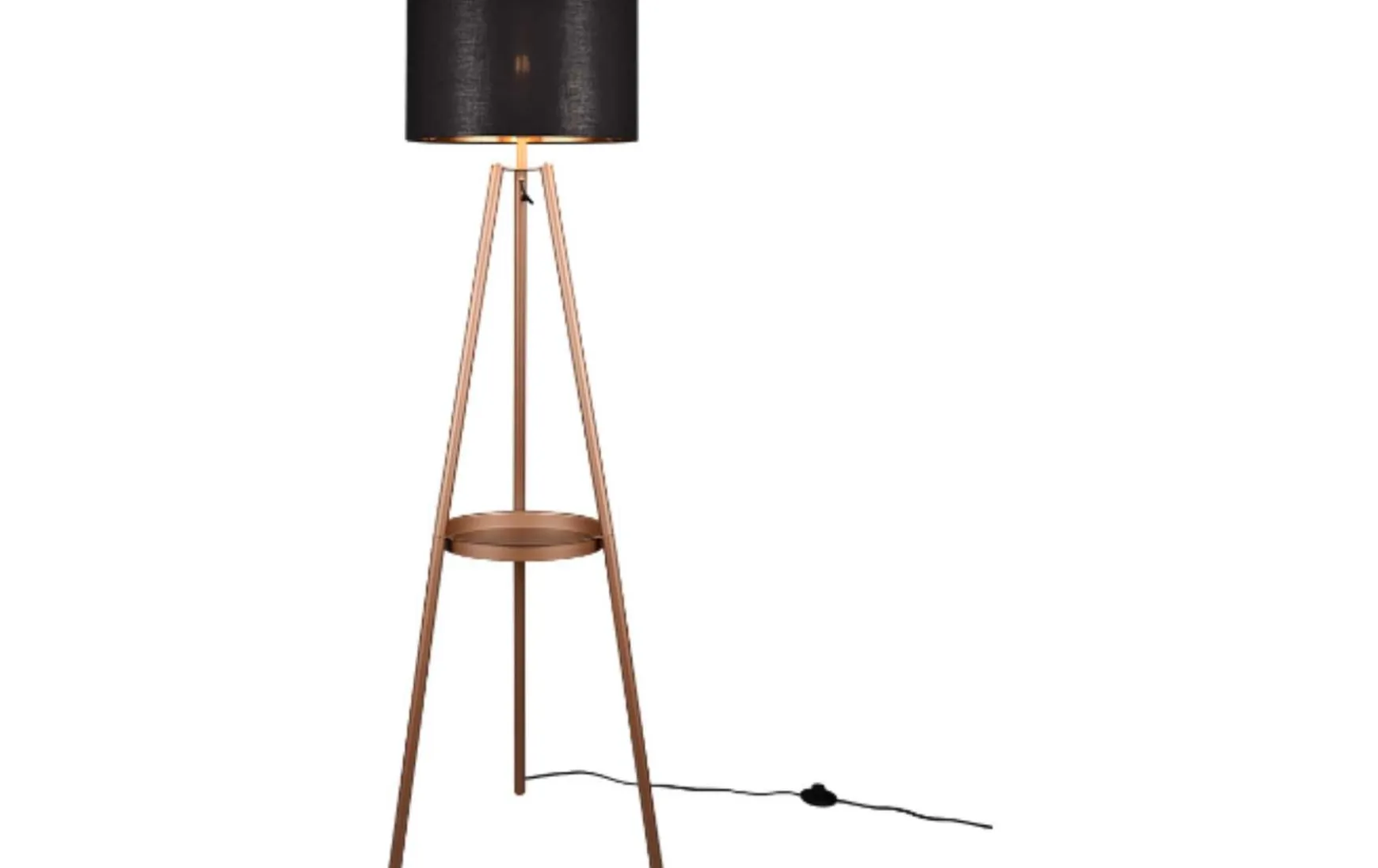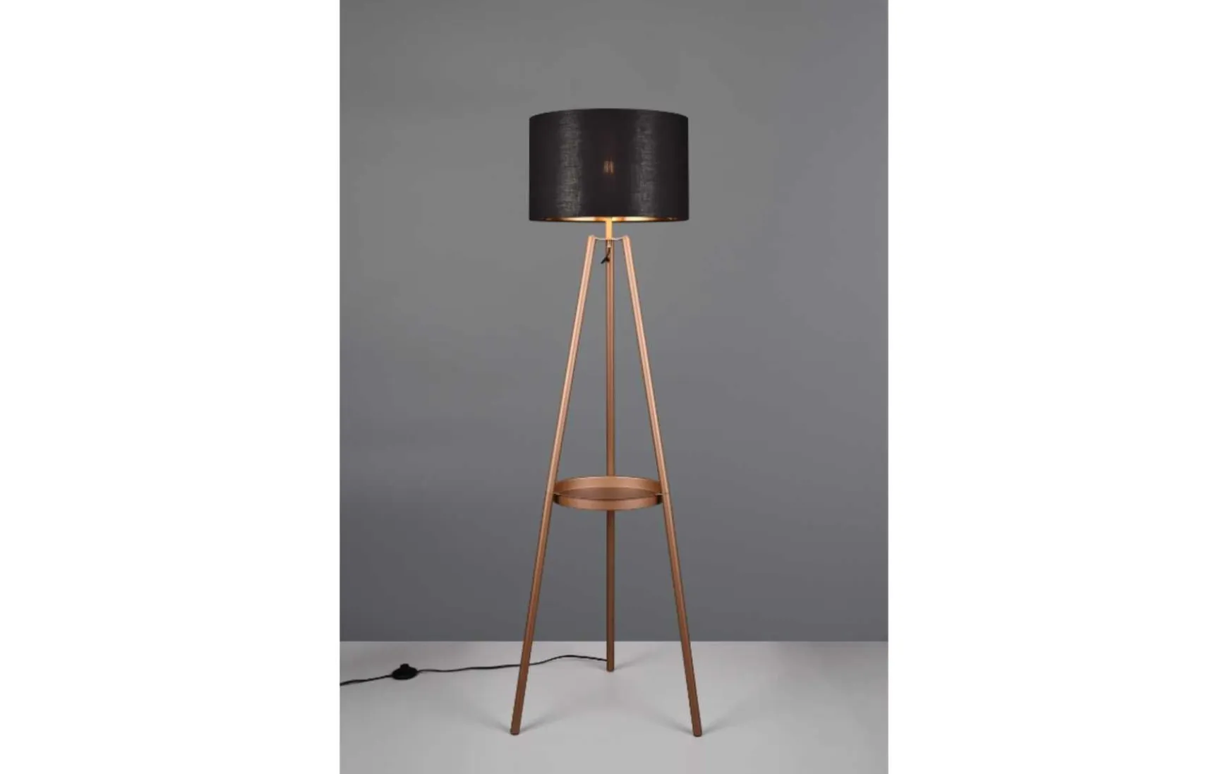 Eine Prise mehr Wohnlichkeit dank dieser Stehleuchte. Die dreibeinige Stehleuchte schafft mit ihrem stylischen Stoffschirm eine gemütliche Lichtinsel, die zum Verweilen einlädt. Die Leuchte kann als Leseleuchte neben dem Sofa oder als alleinstehendes Stilelement im Flur, Wohn- oder Schlafzimmer eingesetzt werden. Als praktisches Extra verfügt die Leuchte über eine kleine Ablagefläche für Deko oder alltägliche Gegenstände, wie etwa ein Buch. Die moderne Farbkombination aus coffeefarbigen Metallbeinen und einem Stoffschirm in Schwarz und Goldfarbe ist sehr beliebt. Für eine energiesparende Beleuchtung empfiehlt sich die Verwendung eines LED Leuchtmittels. Diese sind eine optimale Alternative zu herkömmlichen Halogen Leuchtmitteln und stehen für eine hohe Lichtqualität und eine Energieeinsparung von bis zu 80%. Zusätzlich profitieren Sie bei LED Leuchtmitteln von einer langen Lebensdauer, einer geringen Wärmeentwicklung und schonen gleichzeitig die Umwelt.