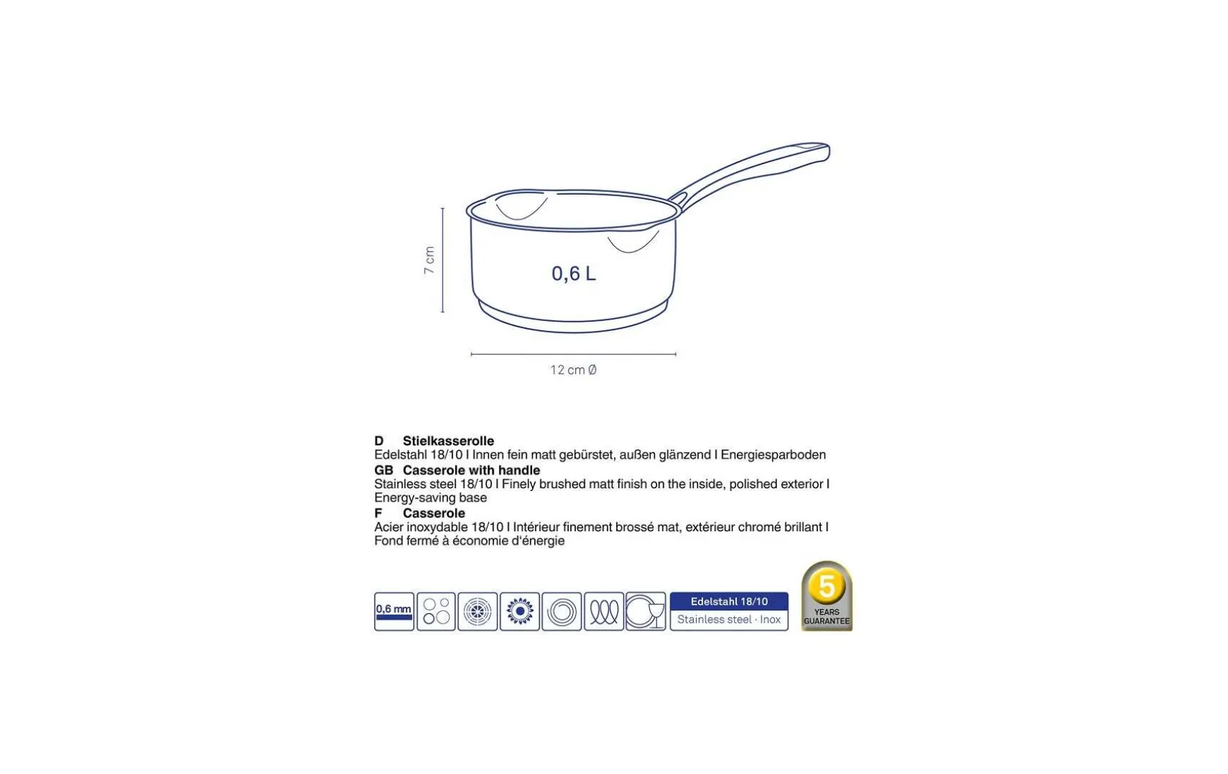 Diese Stielkasserolle ist ein echtes Highlight. Schon auf den ersten Blick erkennt man die hochwertige Verarbeitung. Außen ist die Stielkasserolle glänzend und innen fein, matt gebürstet. Der Topfgriff besteht aus Edelstahlguss. Hochwertige Verarbeitung mit einem aufwendig gefalteten Rand. Es gibt eine praktische Innenskalierung mit welcher Sie leicht das aktuelle Füllvolumen ablesen können. Zwei Ausgüsse ermöglichen ein cleveres Ausgießsystem ohne lästiges Nachtropfen. Der Energiesparboden wurde durch eine sogenannte „Impact-Bonding-Technologie“ verarbeitet. Diese ermöglicht zudem eine perfekte Bodenhaftung, einen maximalen Widerstand gegenüber Temperaturschocks und eine optimale Wärmeverteilung. Die Stilkasserolle eignet sich für alle Herdarten, auch für Induktionsherde und ist nutzbar bis 220°C, mit Deckel bis 180°C.
