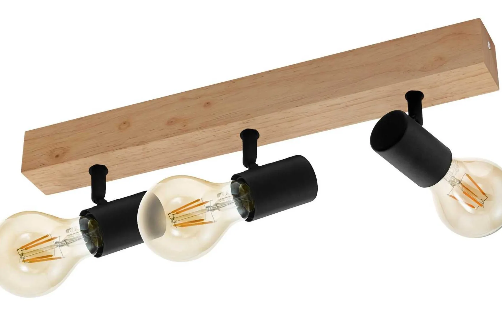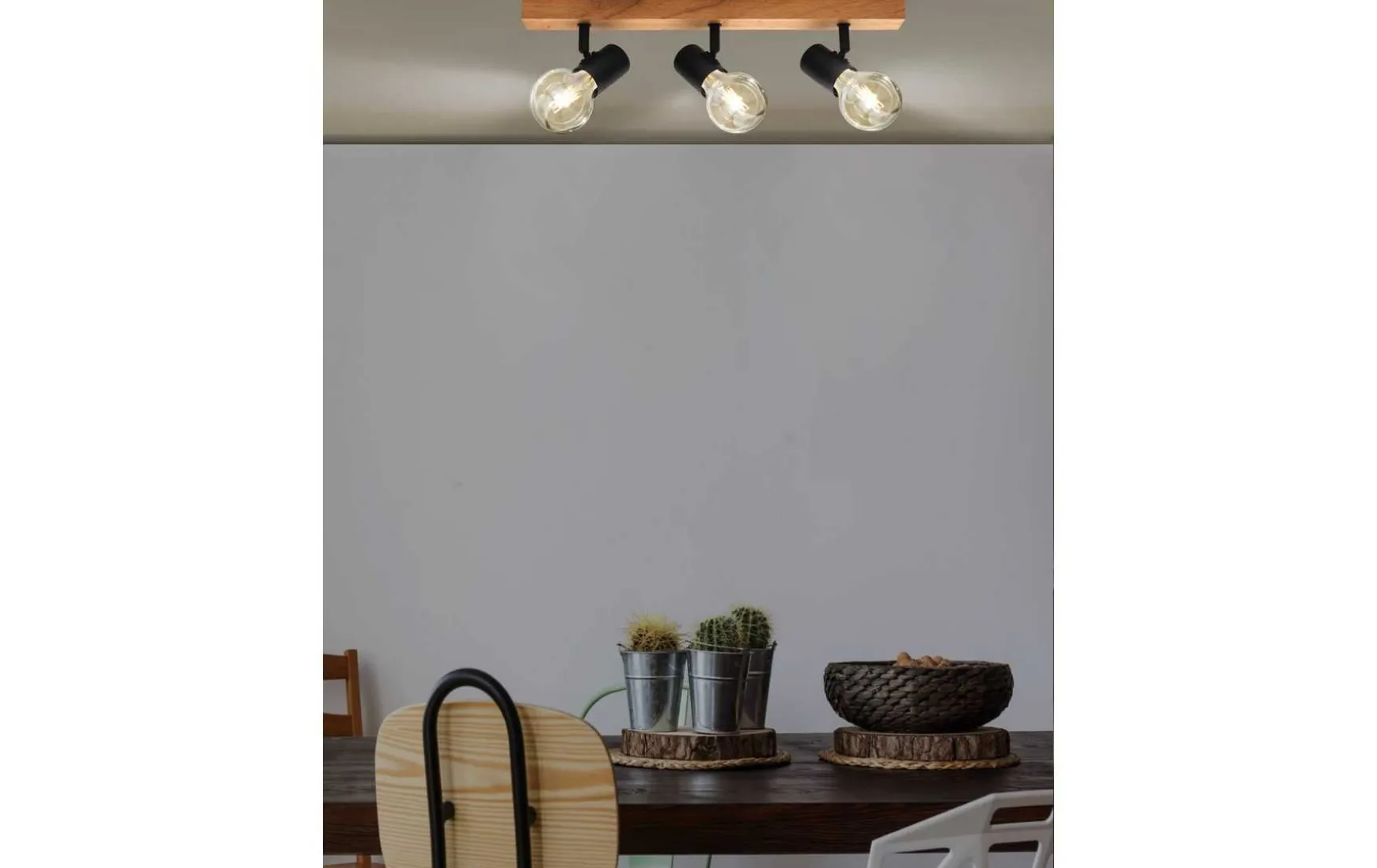 Dieser dreiköpfige Spot aus Holz und schwarzem Stahl ist ein dekoratives Schmuckstück für jedes Zuhause. Sie können frei entscheiden welches E27 Leuchtmittel Sie einsetzen und machen aus dieser Leuchte einen echten Hingucker.