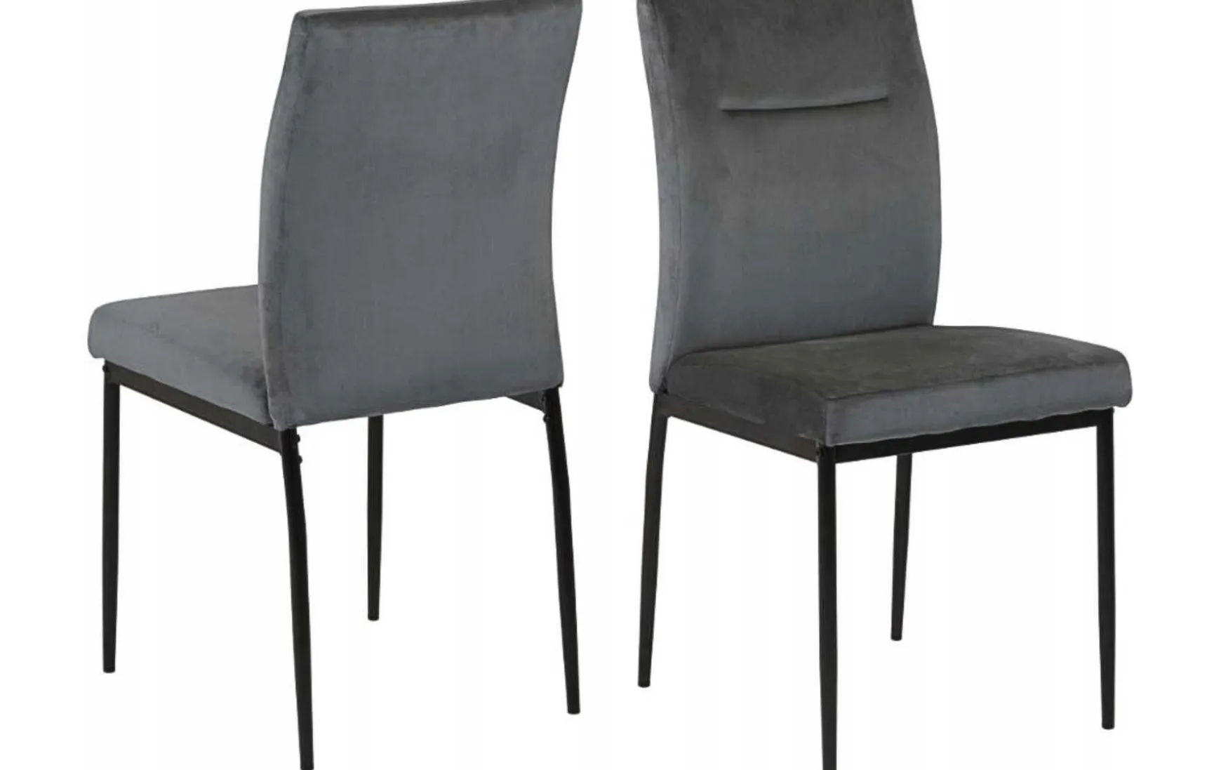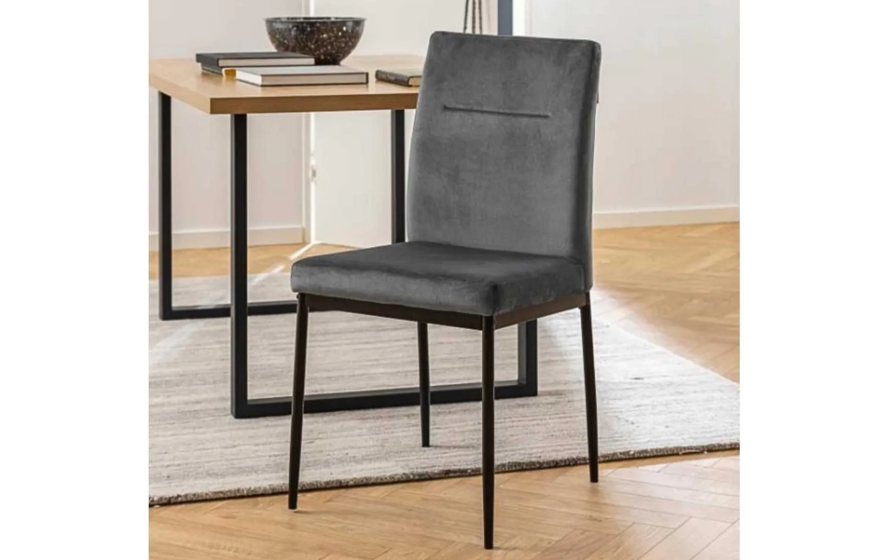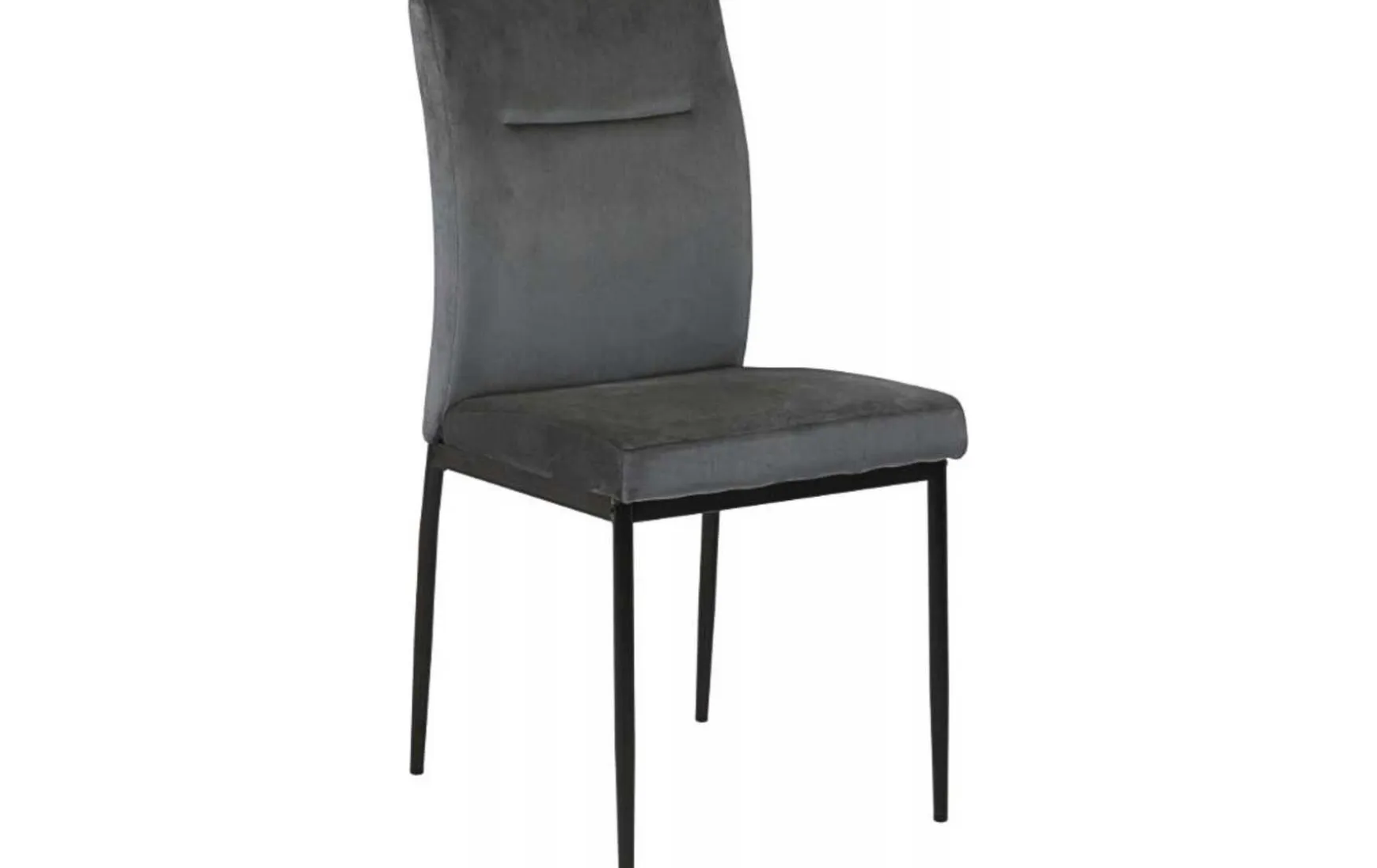 Dieser Esszimmerstuhl ist subtile Eleganz. Er zeichnen sich durch klare Linien ohne Schnörkel aus. Die profilierte Rückenlehne passt sich der Wölbung des Rückens an. Der dunkelgraue Stoff passt gut zum schwarzen Metallfuß.