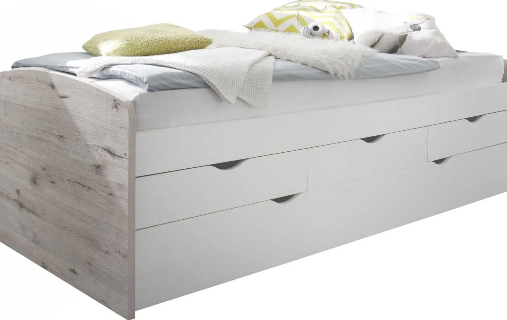 Diese praktische Tandemliege ist die ideale Lösung für Kinder- und Jugendzimmer mit begrenztem Platzangebot. Mit einer Liegefläche von ca. 90 × 200 cm bietet sie komfortablen Schlafplatz und überzeugt zugleich durch ihre funktionale Ausstattung. Die moderne Farbkombination aus Sandeiche und Weiß verleiht dem Möbelstück eine freundliche, zeitlose Optik, die sich harmonisch in unterschiedliche Einrichtungsstile einfügt. Drei integrierte Schubladen sorgen für zusätzlichen Stauraum und bieten Platz für Bettwäsche, Decken oder Spielsachen. Eine platzsparende und zugleich stilvolle Schlaflösung mit Mehrwert.