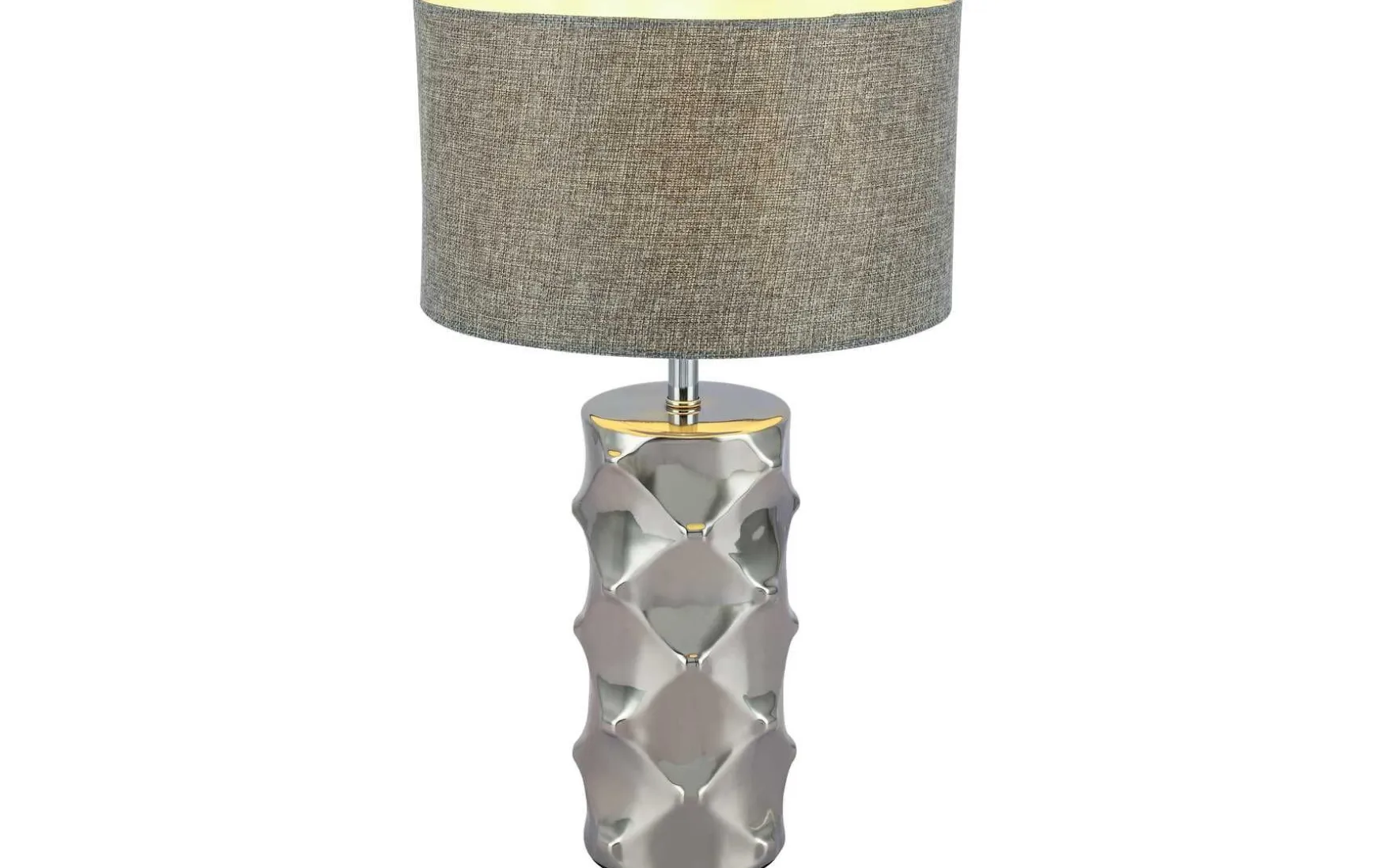 Diese Tischleuchte, setzt sich aus einem elegant geformten verchromten Fuß und einem klassisch gestalteten grauen Textilschirm zusammen.