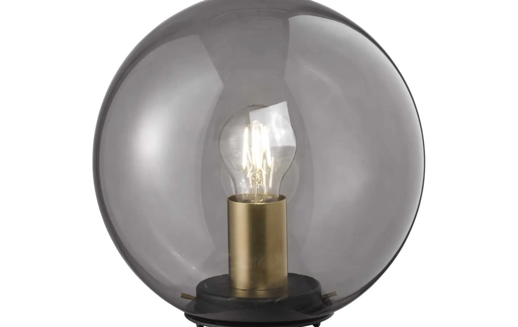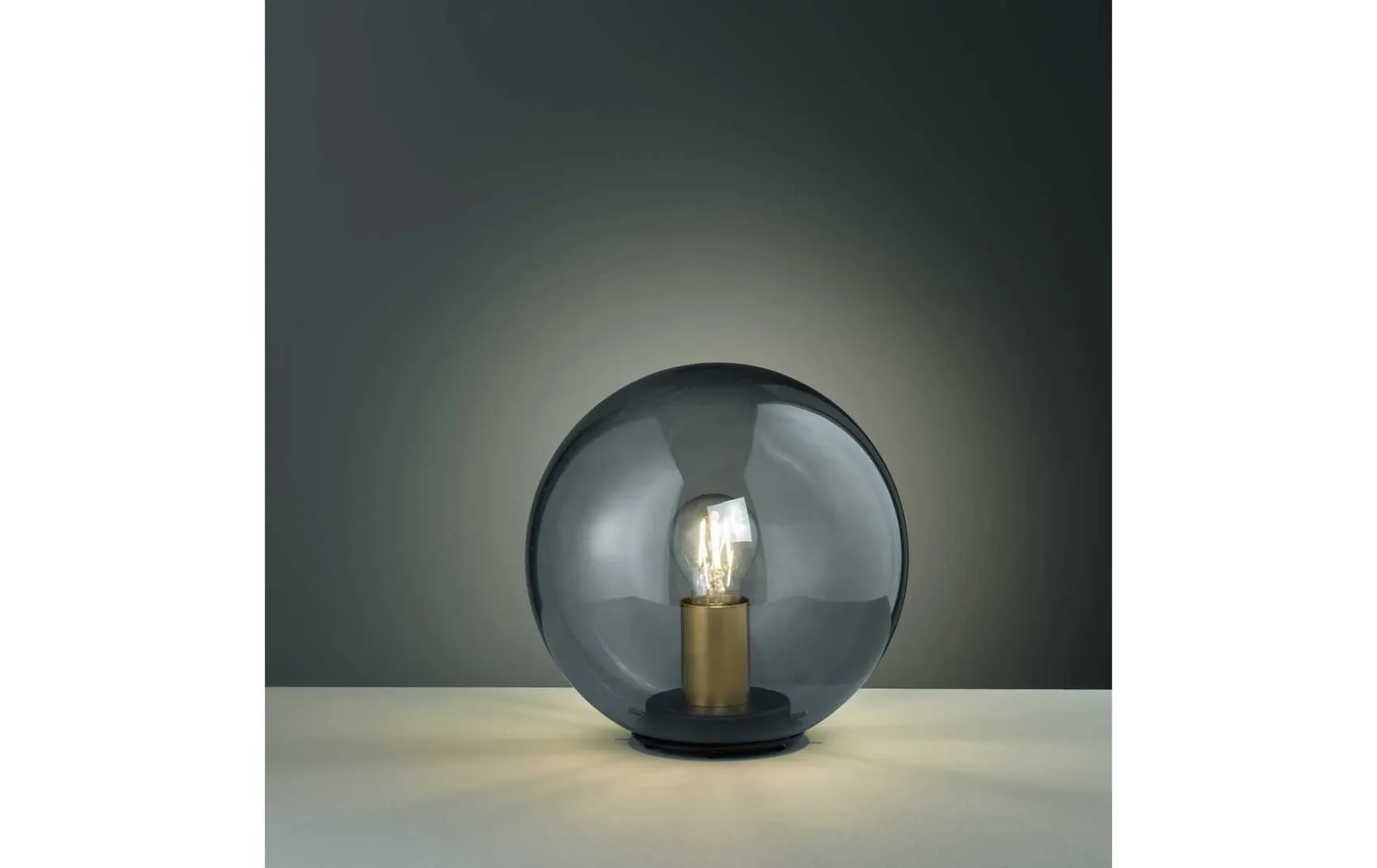 Die Kugelleuchte hat einen Durchmesser von 25 cm und ist aus rauchfarbenem Glas gefertigt.