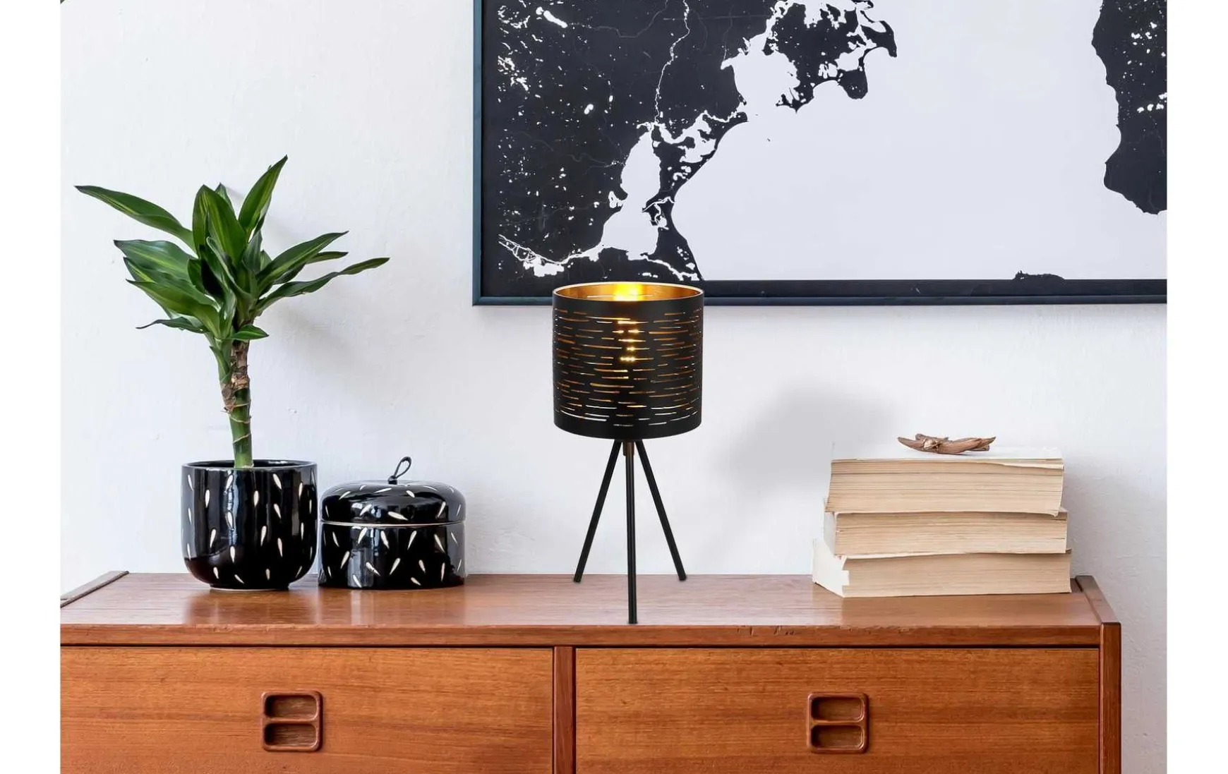Die 35 cm hohe, dreibeinige Tischleuchte besteht hauptsächlich aus einem mit formschönen Dekorstanzungen dekoriertem schwarzem Textil, das von der Innenseite mit Blattgold belegt ist.