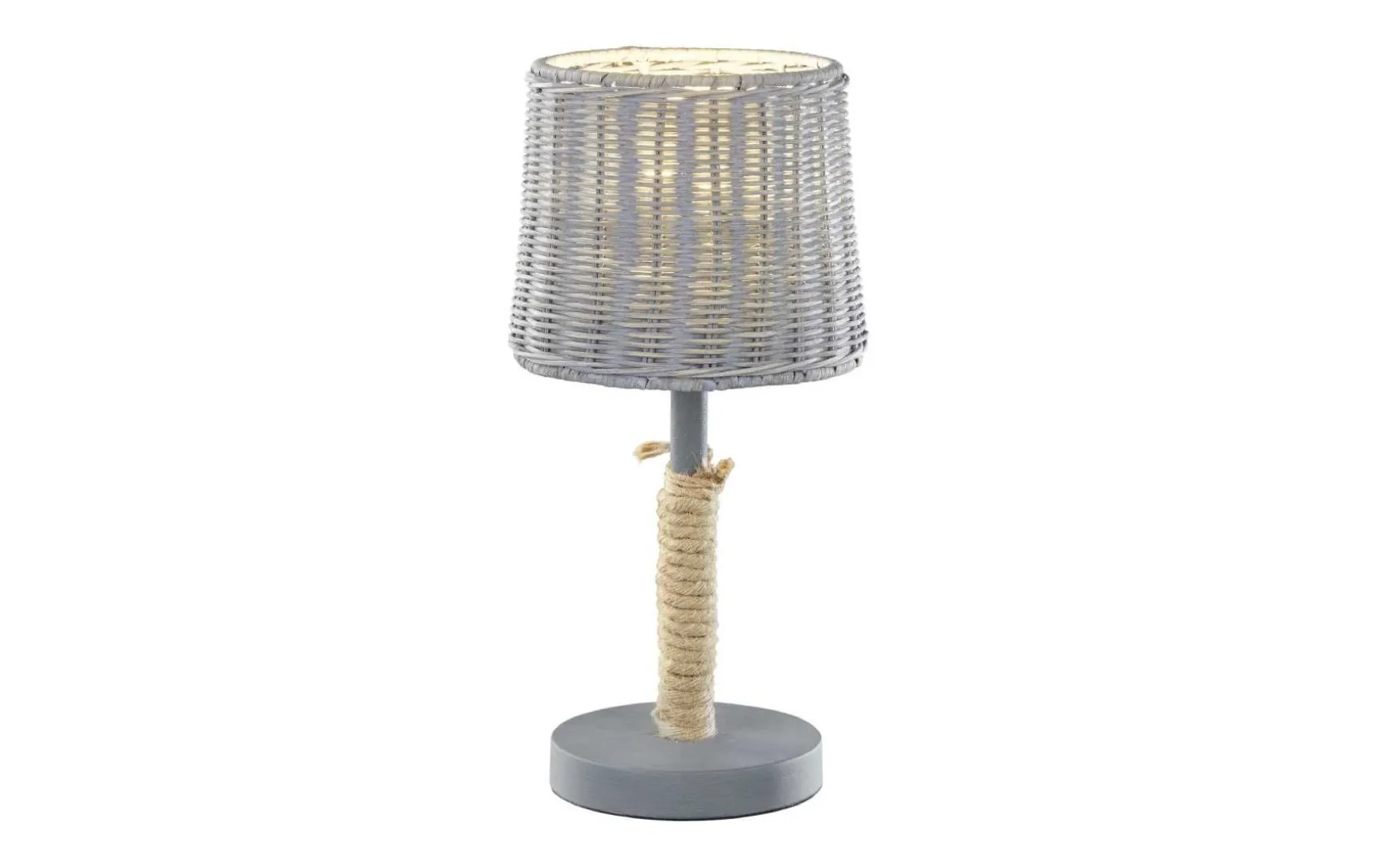 Diese Leuchte im Vintage Stil verkörpert eine perfekte Symbiose aus modernem und klassischem Design. Sie verleiht Ihren Räumlichkeiten Gemütlichkeit und wird gleichzeitig zu einem Dekorationselement. Die Vintage Tischleuchte verleiht jedem Raum das gewisse Etwas. Die Tischleuchte kombiniert Metall mit einem grauen Lampenschirme in Rattan Optik. Zusätzlich ist ein Teil des Leuchtenfußes von einem Seil umwickelt, dass den Vintage Charakter verstärkt. Die Tischleuchte fügt sich besonders in klassische und rustikale Wohnstile ein und setzt durch den Lampenschirm aus Rattan einen besonderen Akzent. Dadurch wirkt die Leuchte modern und dekorativ und wird zu einem Highlight in jedem Raum. Das ausgestrahlte Licht wird angenehm im Raum verteilt und lässt ein gemütliches Ambiente entstehen. Ob als Nachtischleuchte im Schlafzimmer, auf der Kommode oder auf dem kleinen Beistelltisch im Wohnzimmer, die kleine Leuchte wird auch tagsüber zu einem echten Schmuckstück. Die Farbe Grau ergänzt die dezente Lichtdurchlässigkeit der Leuchte und erleichtert die Integration in bereits bestehendes Interieur.