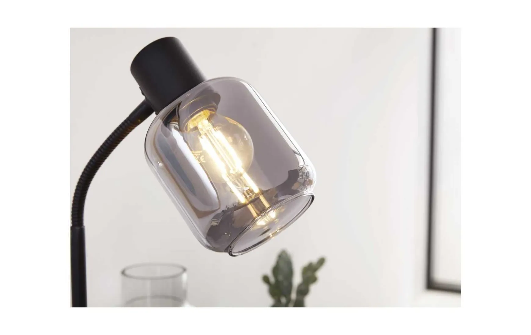 Diese Tischleuchte kombiniert mattschwarzes Metall mit einem Lampenschirm aus verspiegeltem rauchfarbenen Glas. Durch die Materialien und Farben sowie die spezielle Formensprache verkörpert die Tischlampe eine moderne Interpretation des angesagten Industriestils. Sie verleiht dem Raum das gewisse Etwas und sorgt natürlich auch für die gewünschte Helligkeit.