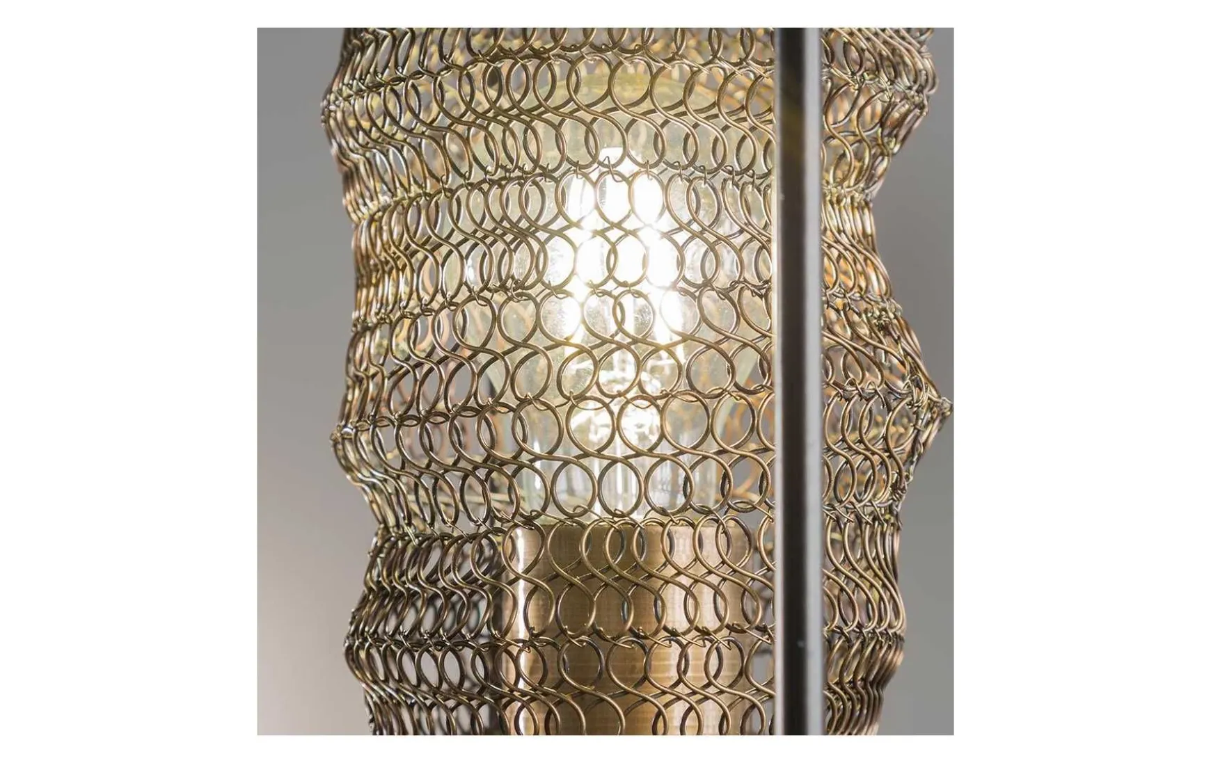 Hergestellt aus Metall befindet sich in dem runden Rahmen die E27 Fassung unter einem messingfarbenem Lampenschirm aus Kettengliedern.