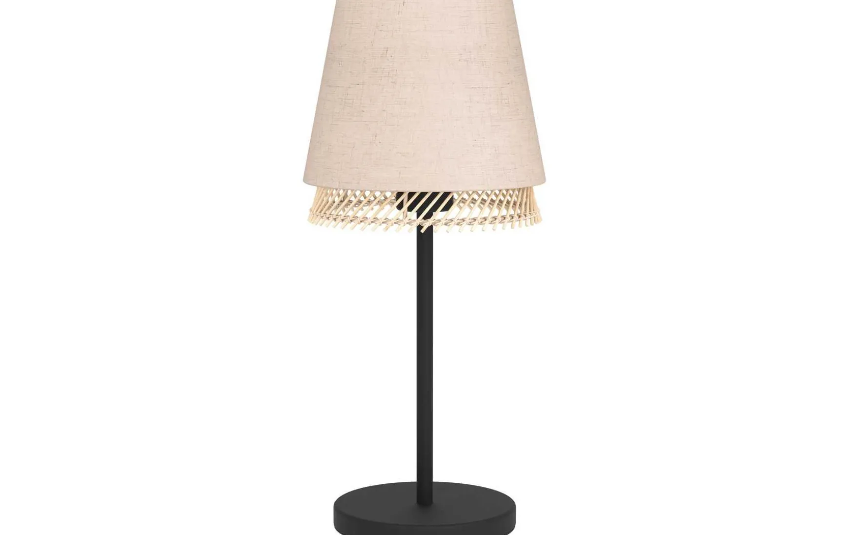 Diese Tischleuchte ist mit zwei ineinandergesetzten runden Lampenschirmen und einem schwarzem Metall-Leuchtenfuß gefertigt. Die harmonische Kombination aus dem äußeren Leinenschirm in naturfarben und dem inneren Schirm aus einem Bambus-Gitter verleiht der Leuchte einen wohnlichen Look. Im eingeschalteten Zustand wird die natürliche Struktur des Stoffes sichtbar. Ebenso ist ein bequemes Ein- und Ausschalten über einen Schalter am Kabel möglich. Die Tischlampe fügt sich in moderne Einrichtungsstile wie den Nature-Trend ein und bietet eine wohnliche Beleuchtung im Schlafzimmer, im Wohnzimmer, Esszimmer oder im Vorzimmer. Geeignet ist die Leuchte für jedes Leuchtmittel mit E27-Sockel.