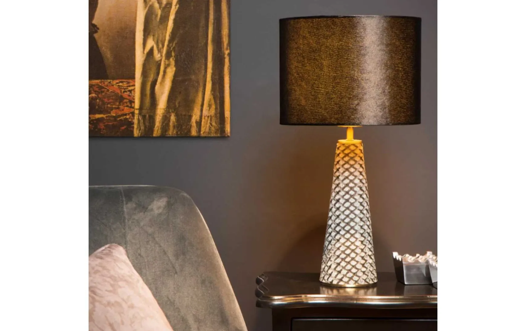 Sie suchen eine elegante Tischleuchte mit einem besonderen Design, die alle Augen auf sich zieht? Ihre Gebete wurden erhört. Der zeitgenössische, zylindrische Lampenschirm ruht auf einem speziellen Sockel. Die Form erinnert an eine Vase. Aber was sie wirklich besonders macht, sind die Materialwahl und die Gestaltung. Das gewebte Muster der Metallverkleidung erwacht zum Leben, wenn Sie Extravaganza Velvet einschalten. Von oben erzeugt das diffuse Glühen einen Dialog zwischen Licht und Schatten. Als ob Licht aus dem Inneren des Lampensockels scheint. Diese optische Täuschung überrascht garantiert jeden Besucher.