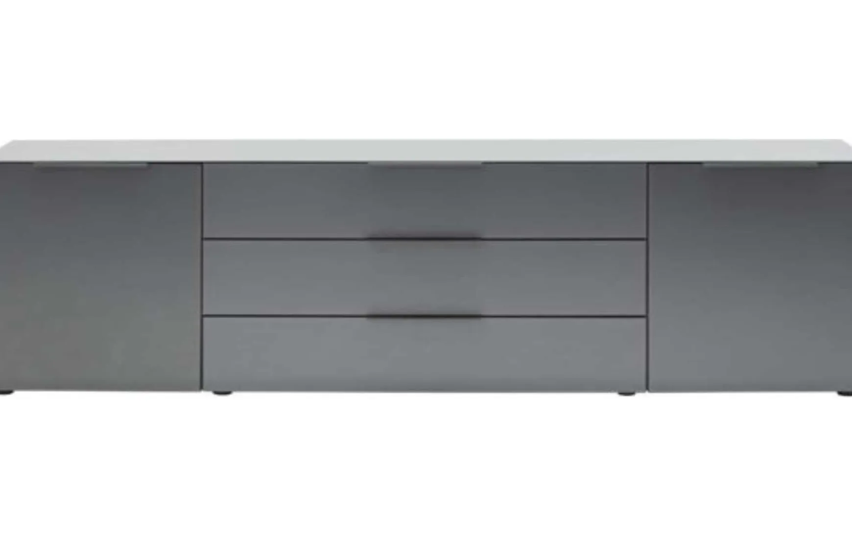 Mit dem Mattlack-Korpus in trendigem Anthrazit und den ebenfalls anthrazitfarbenen Glasfronten strahlt dieses Lowboard moderne Eleganz mit einem gewissen noblen Touch aus. Schlichte Metallgriffe und höhenverstellbare Gleitfüße runden das edle Design harmonisch ab. Dank der hochwertigen, sehr robusten Melaminbeschichtung sind die Oberflächen kratz- und stoßfest sowie angenehm pflegeleicht. Das Medienmöbel begeistert nicht nur in puncto Optik, sondern auch in praktischer Hinsicht. Es bietet Ihnen jede Menge Stauraum. Links und rechts außen befindet sich jeweils eine Holztür. Mittig weist der TV-Schrank drei Schubladen auf. In den verschiedenen Abteilungen können Sie diverse Gegenstände unterbringen, beispielsweise CDs und DVDs oder Blu-rays, aber auch Utensilien für den täglichen Bedarf. Auf dem Oberboden ist Platz für Ihr Fernsehgerät sowie Medienplayer. Auch das ein oder andere dekorative Element kommt hier wunderbar zur Geltung.