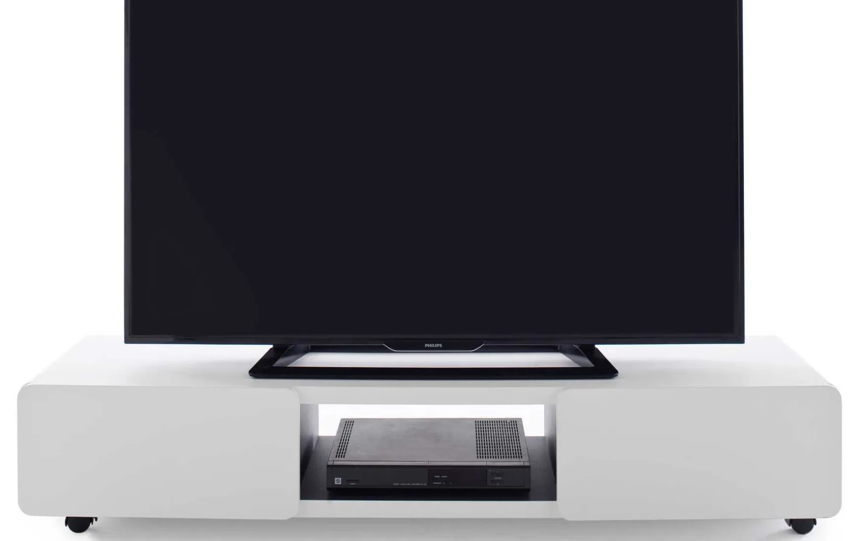 Mit dem Lowboard setzen Sie einen neuen Trend in Ihrem Wohnbereich. Das Design im modernen Weiß und Applikationen im anthrazitfarbenenNachbildung zieht die Blicke auf sich. Abgerundete Ecken runden das Gesamtbild ab. Ausgestattet mit zwei Türen und einem Gerätefach bietet Ihnen das attraktive Lowboard einiges an Stauraum. Ein Highlight sind die Rollen. Schnell ist das moderne Lowboard in eine andere Position gebracht. Genießen Sie die Flexibilität, die Ihnen das Lowboard bietet.