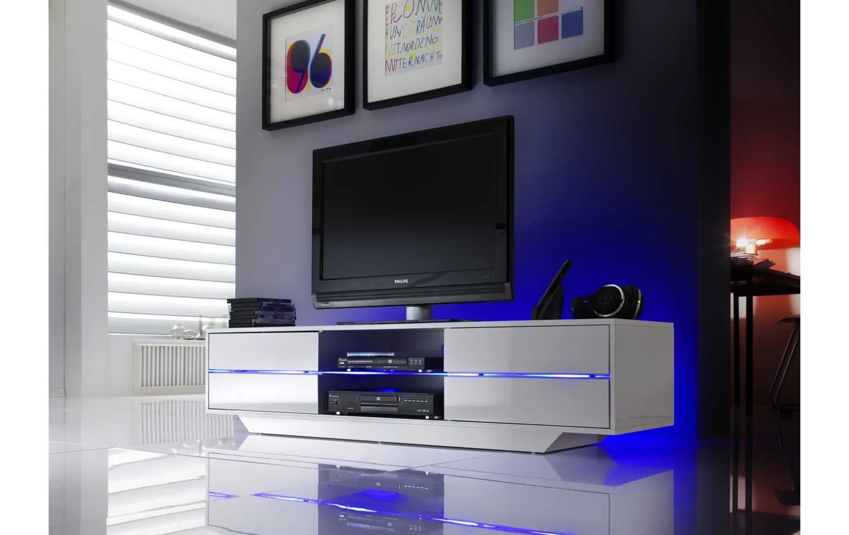 Das TV-Lowboard in weiß Hochglanz lackiert (160 x 36 cm) ist nicht nur praktisch und funktional, sondern sieht auch noch schön aus. Das Medienelement findet in jedem Wohnzimmer seinen Platz. Es besitzt einen Glasboden. Die maximale Belastbarkeit beläuft sich auf bis zu 40 Kilogramm. Sie werden dank der Push-to-Open-Funktion viel Freude mit dem Medienelement „Blues haben. Das TV-Lowboard besitzt vier Schubkästen. Als eingebaute Extras hat es zwei offene Fächer und eine LED-Beleuchtung. Das Modell „Blues“ verfügt über einen Kabeldurchlass. Es macht in seinem modernen sowie hochwertigen Stil eine hervorragende Figur. Die Farbe ist hochglänzendes Weiß. Das Möbelstück ist aus lackiertem MDF gefertigt. Es ist pflegeleicht. Das Modell „Blues“ ist des Weiteren 36 cm hoch, 160 cm breit und 40 cm tief. Das TV-Lowboard von MCA darf in keinem Wohnbereich fehlen. Es begeistert außerdem mit dem Merkmal: alle Schubkästen mit Grifffräsung.