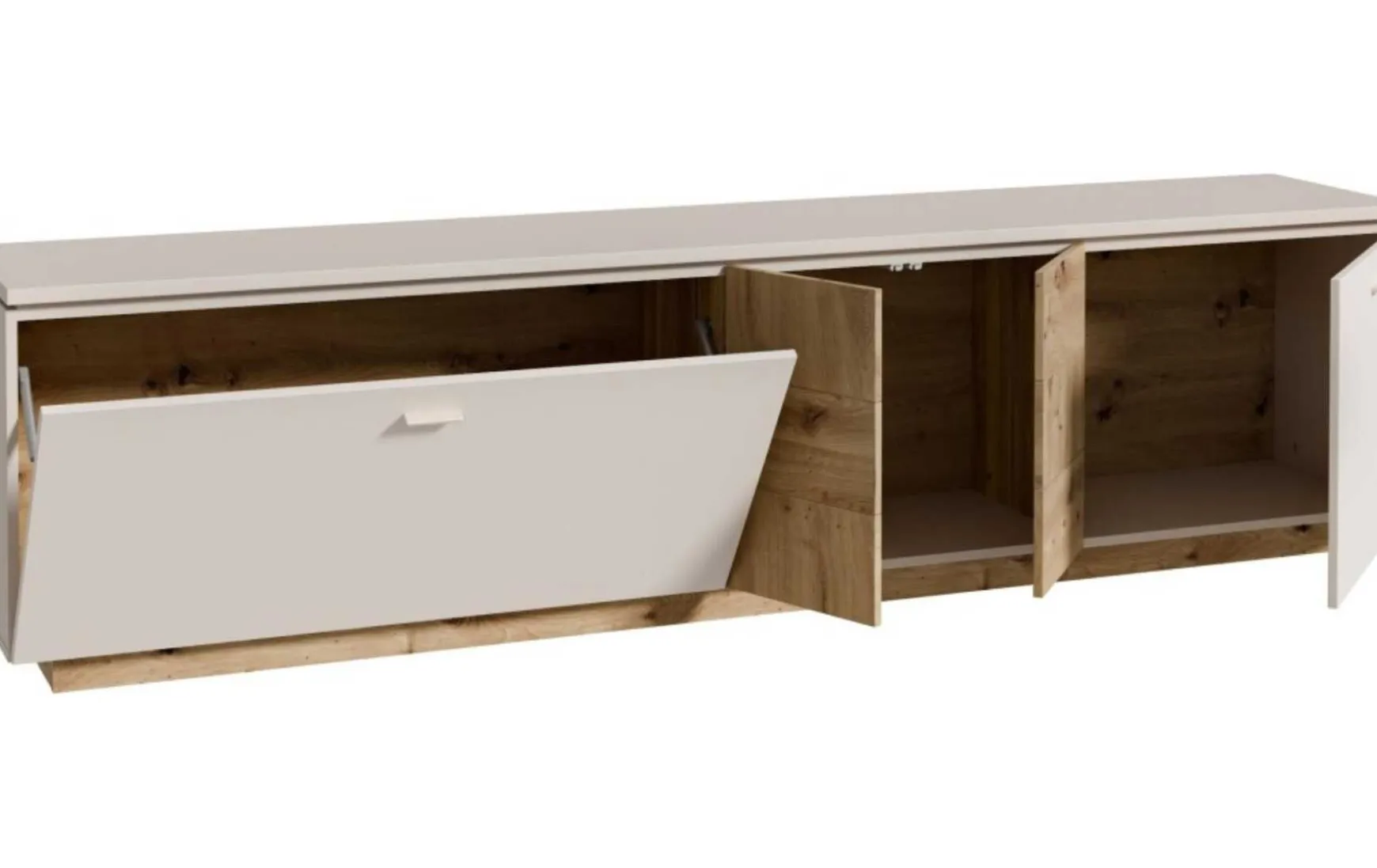 Das Lowboard in Sandfarbe mit Absetzungen in Artisan Eiche Dekor vereint modernes Design mit innovativer Funktionalität und wird zum stilvollen Mittelpunkt deines Wohnbereichs. Mit seinen großzügigen Maßen von 224,8 × 57,7 × 41,6 cm (B × H × T) bietet es viel Stauraum für Mediengeräte, Zubehör und Wohnaccessoires. Der elegante sandfarbige Korpus wird durch warme Artisan-Eiche-Akzente harmonisch ergänzt und sorgt für eine zeitlose, wohnliche Ausstrahlung. Dank Soft-Close-Technologie schließen Türen und Klappen sanft und leise, während die Push-to-Open-Funktion ein griffloses, minimalistisches Erscheinungsbild ermöglicht. Die schwebende Optik verleiht dem Lowboard zusätzliche Leichtigkeit und unterstreicht den modernen Charakter. Ob als TV-Lowboard oder stilvolle Stauraumlösung – dieses Möbelstück kombiniert Design, Komfort und Funktion auf hohem Niveau.