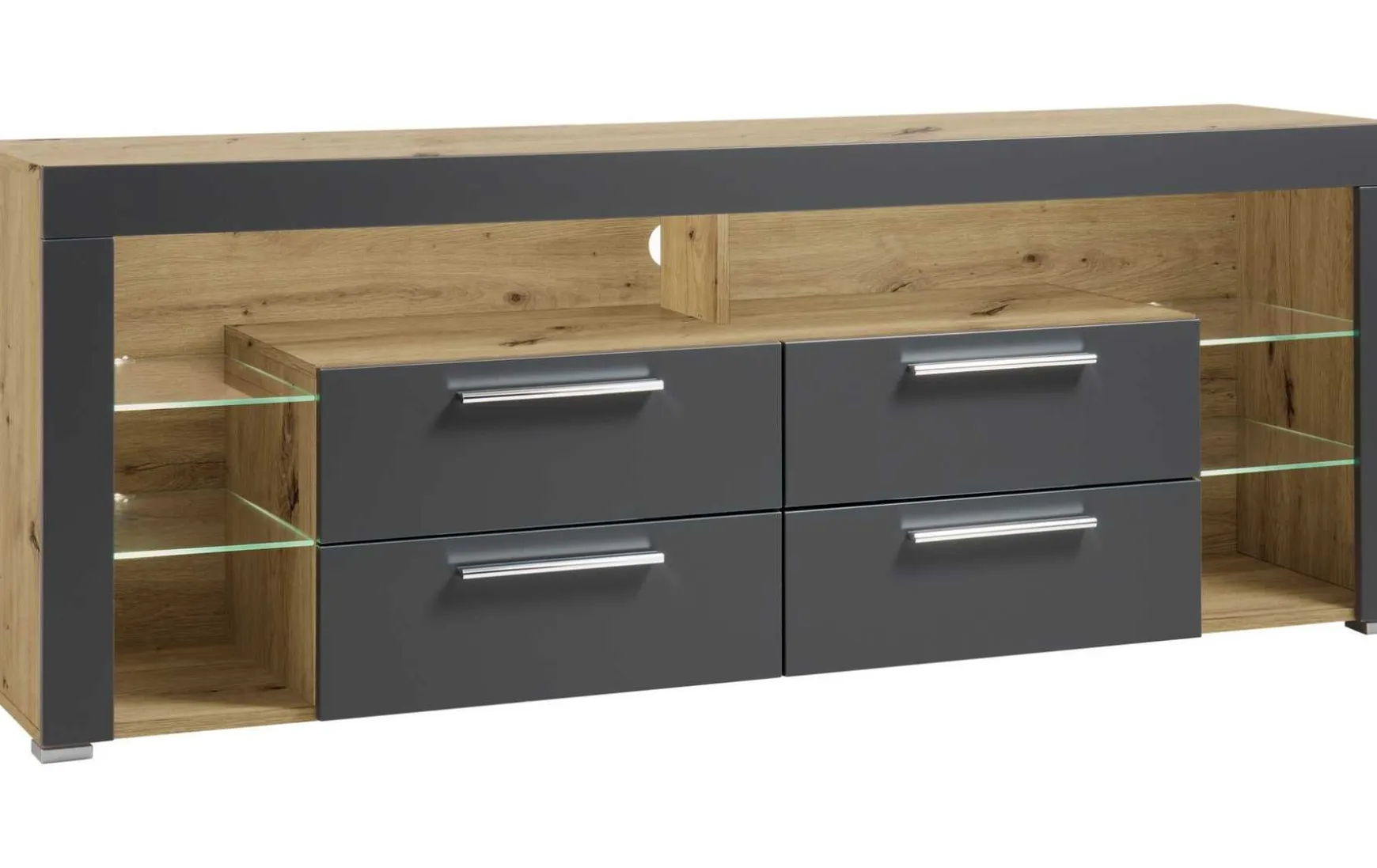 Einen aufregenden Anblick bietet Ihnen dieses Lowboard. Mit seinem Glasboden und Korpusbeleuchtung wird dieses Exemplar zu einem echten Hingucker. Durch sein angesagtes Aussehen passt das TV-Board in nahezu jeden Raum.