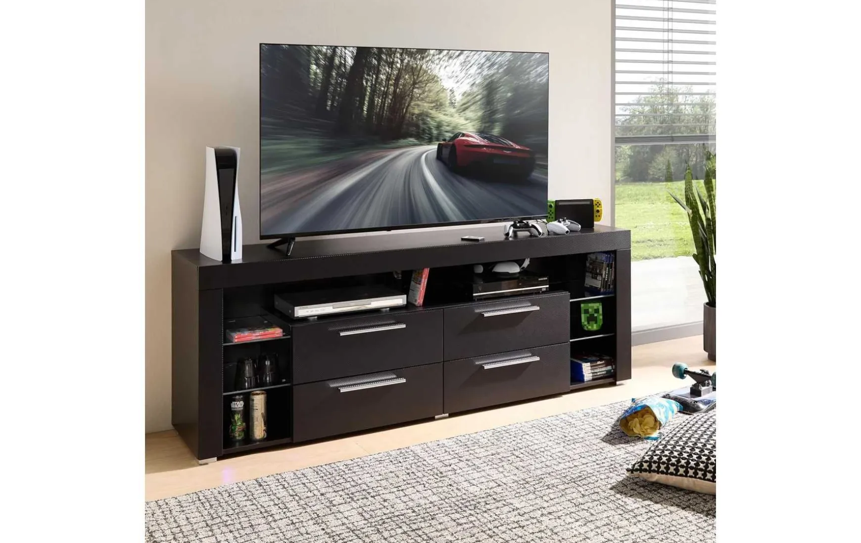 Das TV-Lowboard überzeugt mit seiner Front in Carbon-Optik, die einen modernen Akzent setzt. Der schwarze Korpus ergänzt das Design harmonisch, während silberne Griffe das Gesamtbild abrunden. VIEL STAURAUM – Die zahlreichen, offenen Fächer und die geräumigen Schubladen bieten genügend Stauraum für Multimedia Geräte und Zubehör. Der Oberboden bietet ausreichend Platz für einen Fernseher. RGB-BELEUCHTUNG – Die integrierte RGB-Beleuchtung im Korpus und an den Kanten schafft eine anpassbare Lichtatmosphäre, die sowohl das Lowboard als auch den gesamten Raum eindrucksvoll in Szene setzt. LEICHTE MONTAGE – Der TV-Schrank ist dank der detaillierten Anleitung schnell & leicht montiert und somit für Anfänger geeignet. Das Montage-Material ist inklusive. Maße: 179 x 67 x 44 cm (B/H/T).