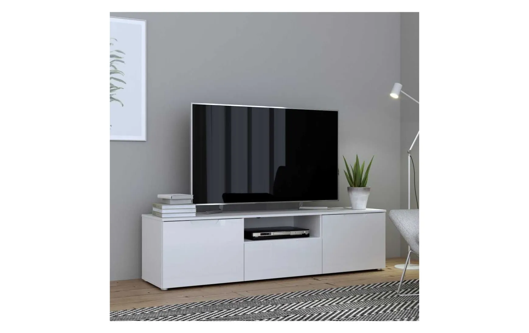 Dieses TV-Lowboard überzeugt durch das überragende Design und mit Fronten in Weiß Hochglanz. Die speziell behandelten Oberflächen dieses Möbels sind besonders pflegeleicht. Die praktischen und gleichzeitig unauffälligen Griffmulden ermöglichen ein einfaches öffnen der Türen.