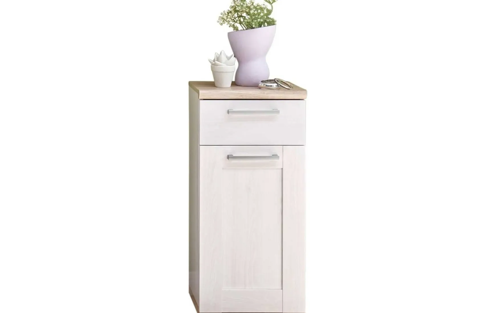 Der bodenstehende Unterschrank im Landhausstil überzeugt durch ein stilvolles, zeitloses Design und bietet viel Stauraum auf kompakter Fläche. Dank einer Kombination aus Tür, Schublade und Boden eignet sich der freistehende Schrank ideal für Bad, Flur oder Wohnräume. Die helle Farbgestaltung in Weiß (Sibiu Lärche) mit Eiche-Absetzungen in San Remo hell verleiht dem Möbelstück eine freundliche und natürliche Ausstrahlung, während alufarbene Metallgriffe das Design modern abrunden. Gefertigt aus robuster Spanplatte, steht der Unterschrank stabil auf dem Boden und passt mit seinen Maßen von ca. 38 x 32 x 82 cm (B/T/H) auch in kleinere Räume. Die Lieferung erfolgt zerlegt, Dekoration ist nicht im Preis enthalten.