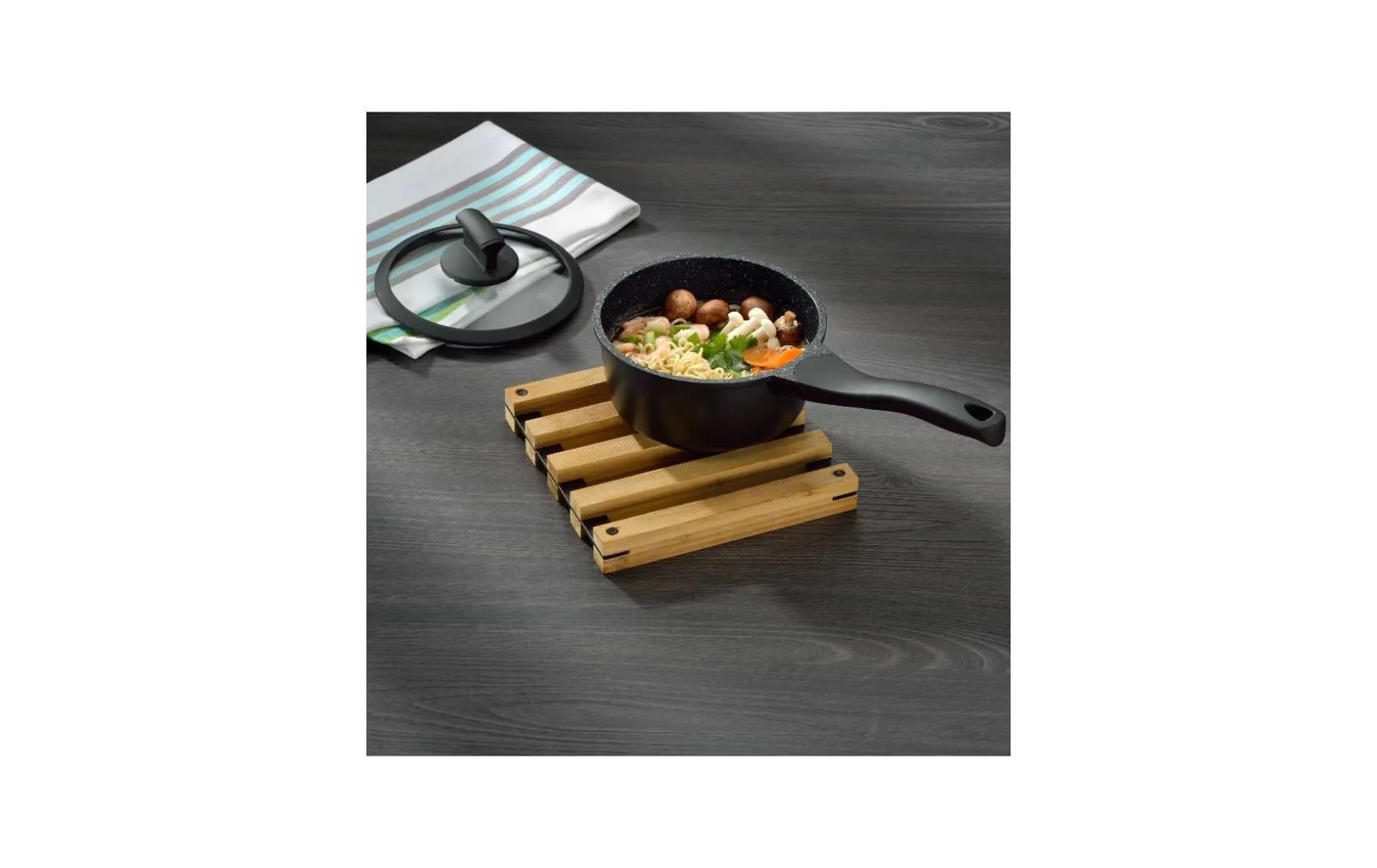 Der Topfuntersetzer besteht aus doppellagigem Bambus und ist daher besonders stabil. Er besticht durch sein einfaches, aber elegantes, durch den schwarzen Akzent aber auch modernes Design. Die typische hellbraune Farbe ist neutral und passt auf jeden Tisch. Durch eine zusätzliche, passende Tischdekoration steht dem perfekten Tischbild nichts mehr im Weg.