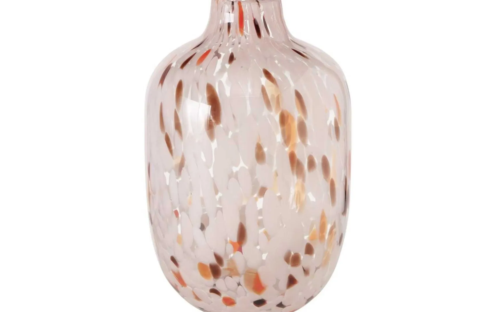 Diese elegante Glasvase mit rosa-beigem Punktmuster ist eine zarte und charmante Dekoration, die Ihrem Interieur einzigartigen Charme und Charakter verleiht. Mit seinem dezenten und dennoch auffälligen Design stellt dieses praktische Blumenarrangement Ihre Lieblingspflanzen wunderschön zur Schau oder ist eine schöne Dekoration für sich allein.