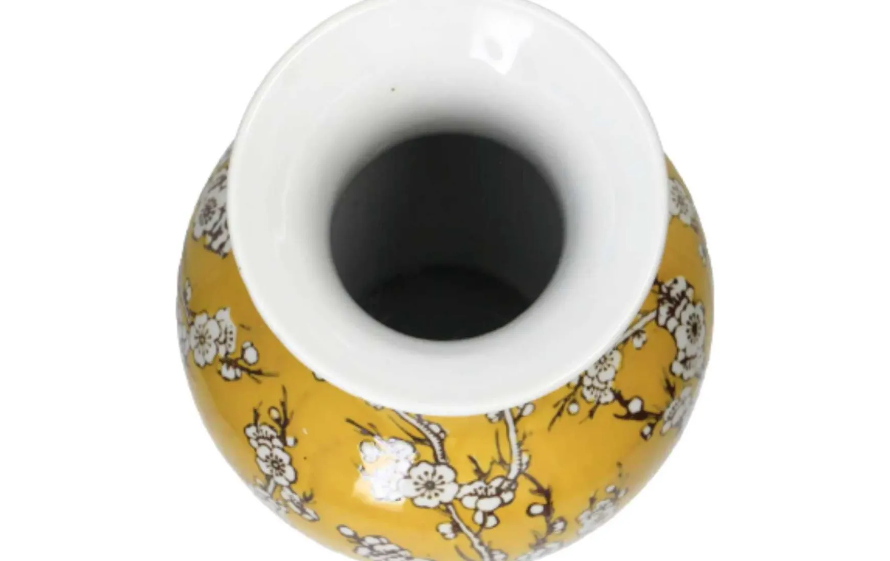 Mit dieser Vase im Farbton „China Gold“ holst du dir fernöstliches Flair in dein Zuhause. Sie ist aus hochwertigem Porzellan gefertigt und zeichnet sich durch das typische chinesische Blumenmuster aus. Dieses präsntiert sich in schwarz-weiß auf Goldgelbem Hintergrund.