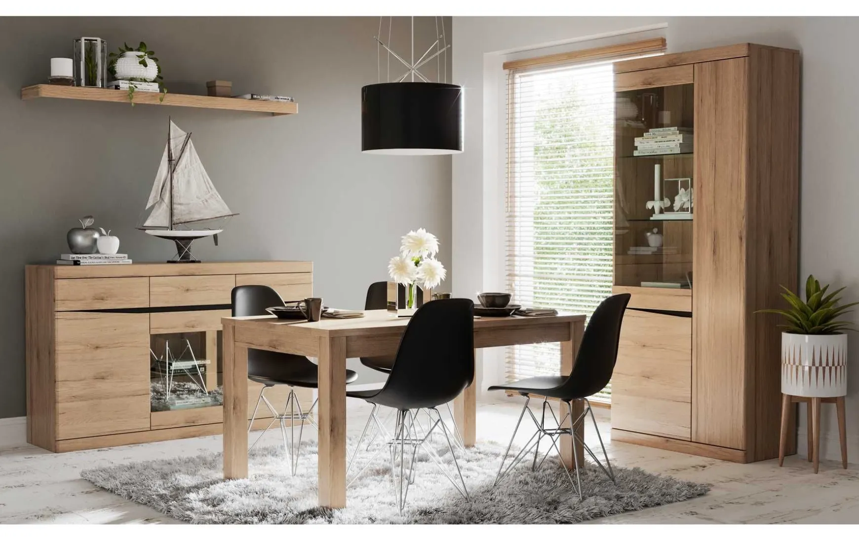 Die moderne Vitrine in San Remo Eiche hell überzeugt durch zeitloses Design und hochwertige Ausstattung. Drei Türen mit eleganter, griffloser Front und Rauchglas sorgen für eine stilvolle Präsentation von Geschirr oder Deko. Dank Soft-Close-Funktion schließen Türen und Schubkästen besonders leise und komfortabel. Der robuste Korpus aus MDF mit Melaminharzbeschichtung bietet Stabilität bei einer Höhe von ca. 196 cm. Mit ihren kompakten Maßen ist die Vitrine vielseitig einsetzbar und individuell planbar.