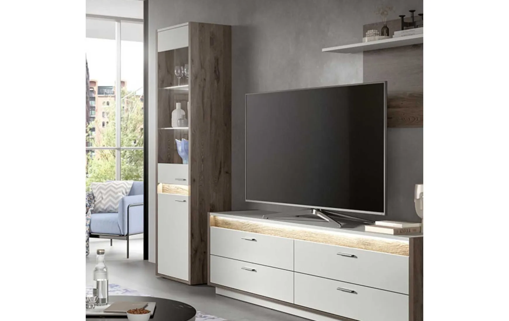 Das moderne, klare Design des Vitrinenschranks in Hellgrau bringt Stil und Eleganz in Ihr Zuhause. Die integrierte LED-Beleuchtung setzt dekorative Objekte wie Vasen, Sammlerstücke oder Geschirr gekonnt in Szene und sorgt für eine angenehme Atmosphäre.