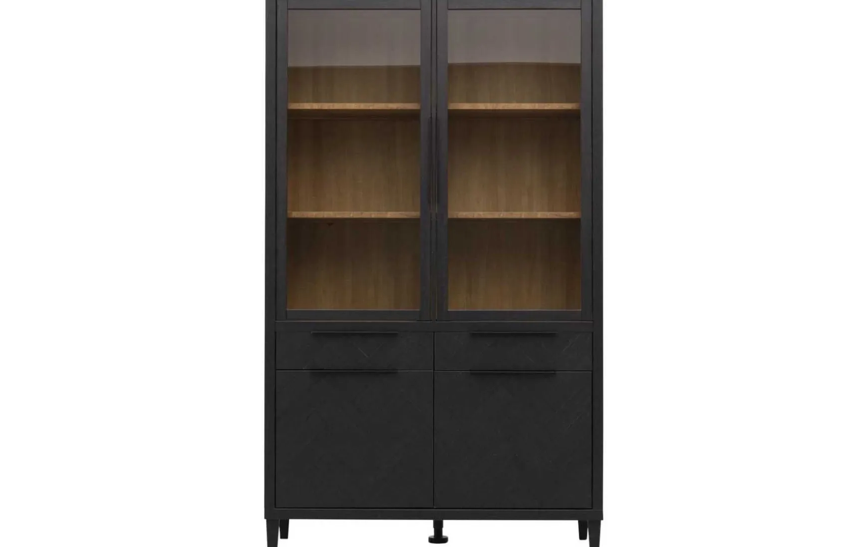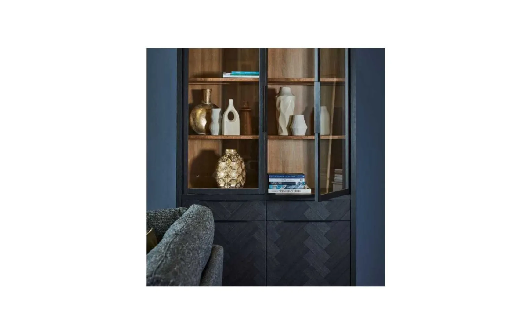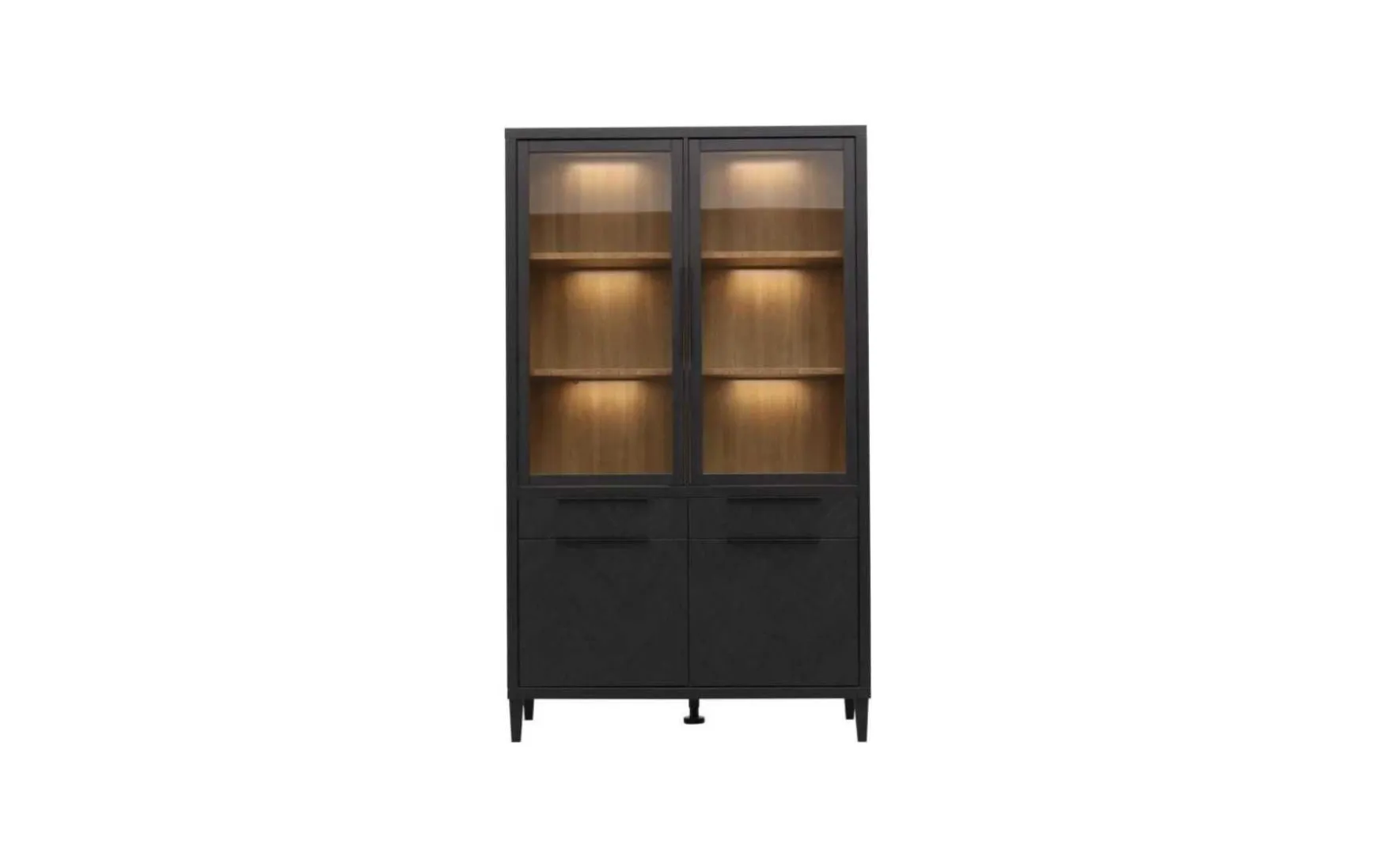 Diese Vitrine begeistert mit ihrer Holzoptik und dem edlen Fischgrätenmuster auf den dunkelgrauen Fronten. Innen ist die vitrine naturbelassen. Dieses Detail sorgt für einen stilvollen Kontrast. Hinter den Glaseinsätzen kommen deine schönsten Dekoaccessoires dank der Beleuchtung hervorragend zur Geltung.