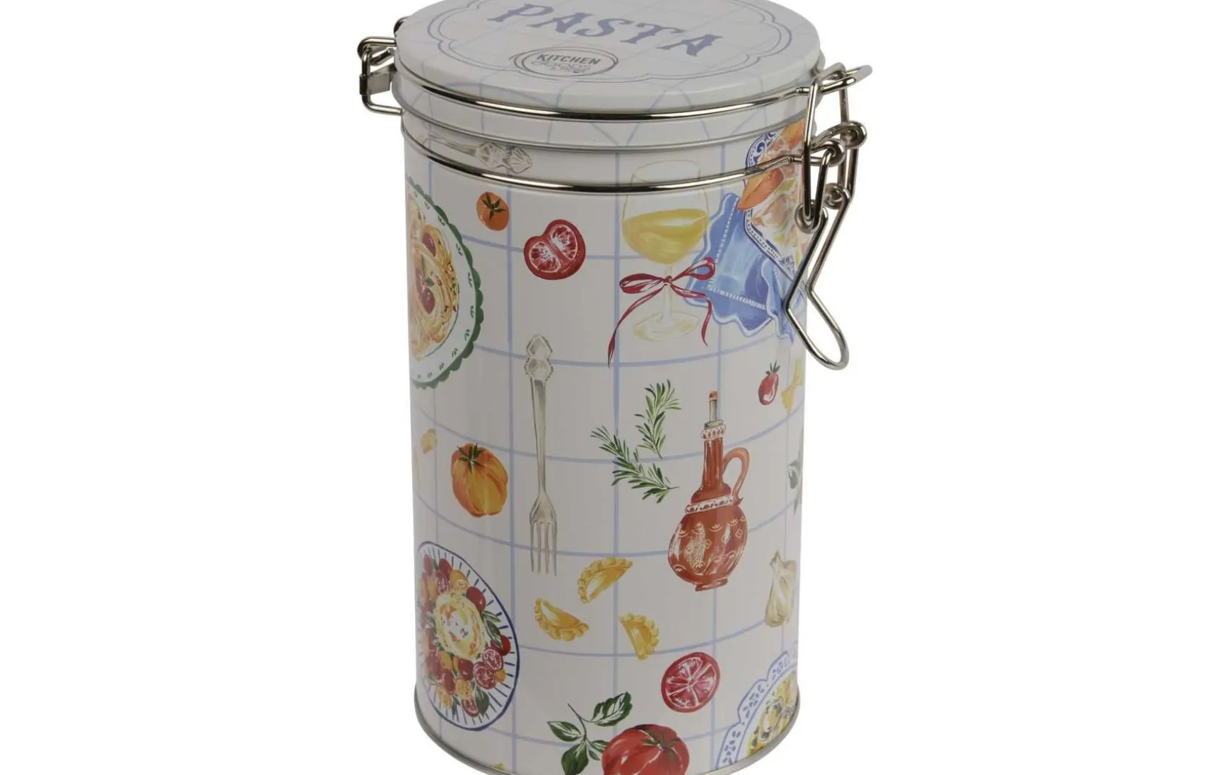 Bringen Sie Verspieltheit und Ordnung in Ihre Küche – mit diesem runden Küchenbehälter mit farbenfrohem Pasta-Motiv.