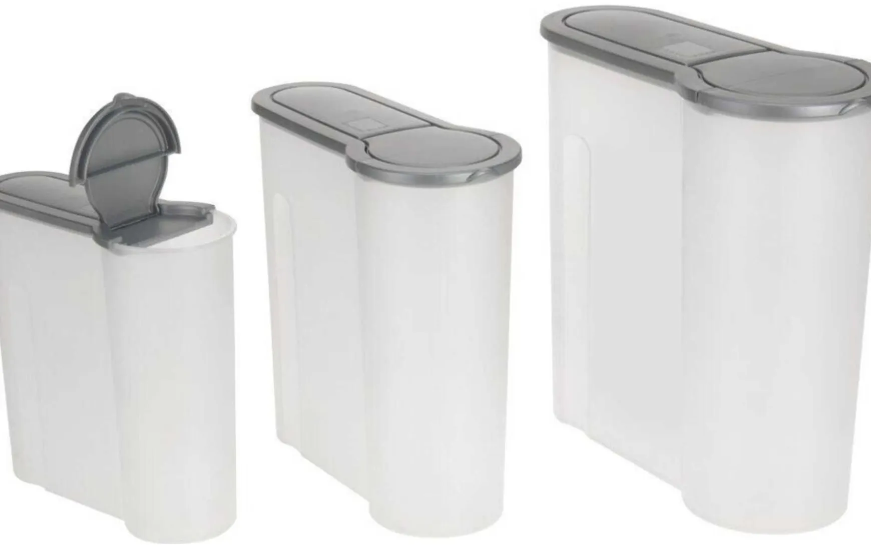 Ein Satz loser Behälter, ideal als Küchenorganisator und Aufbewahrungsbehälter. Das Shaker-Set umfasst drei Behälter mit unterschiedlichen Größen – 4000 ml, 2400 ml und 1300 ml. Die Behälter verfügen über einen abnehmbaren grauen Deckel mit transparentem Kunststoffboden.