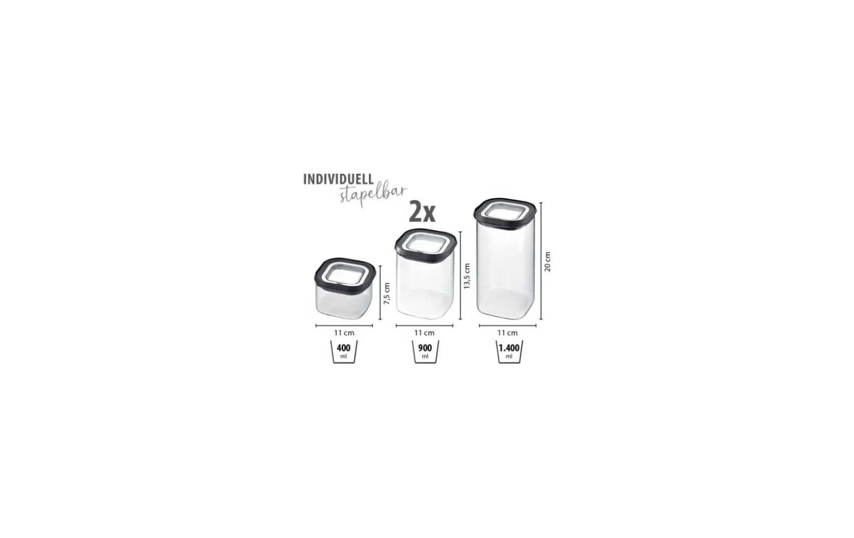 - Füllvolumen 400 ml, 2x 900 ml, 1.400 ml