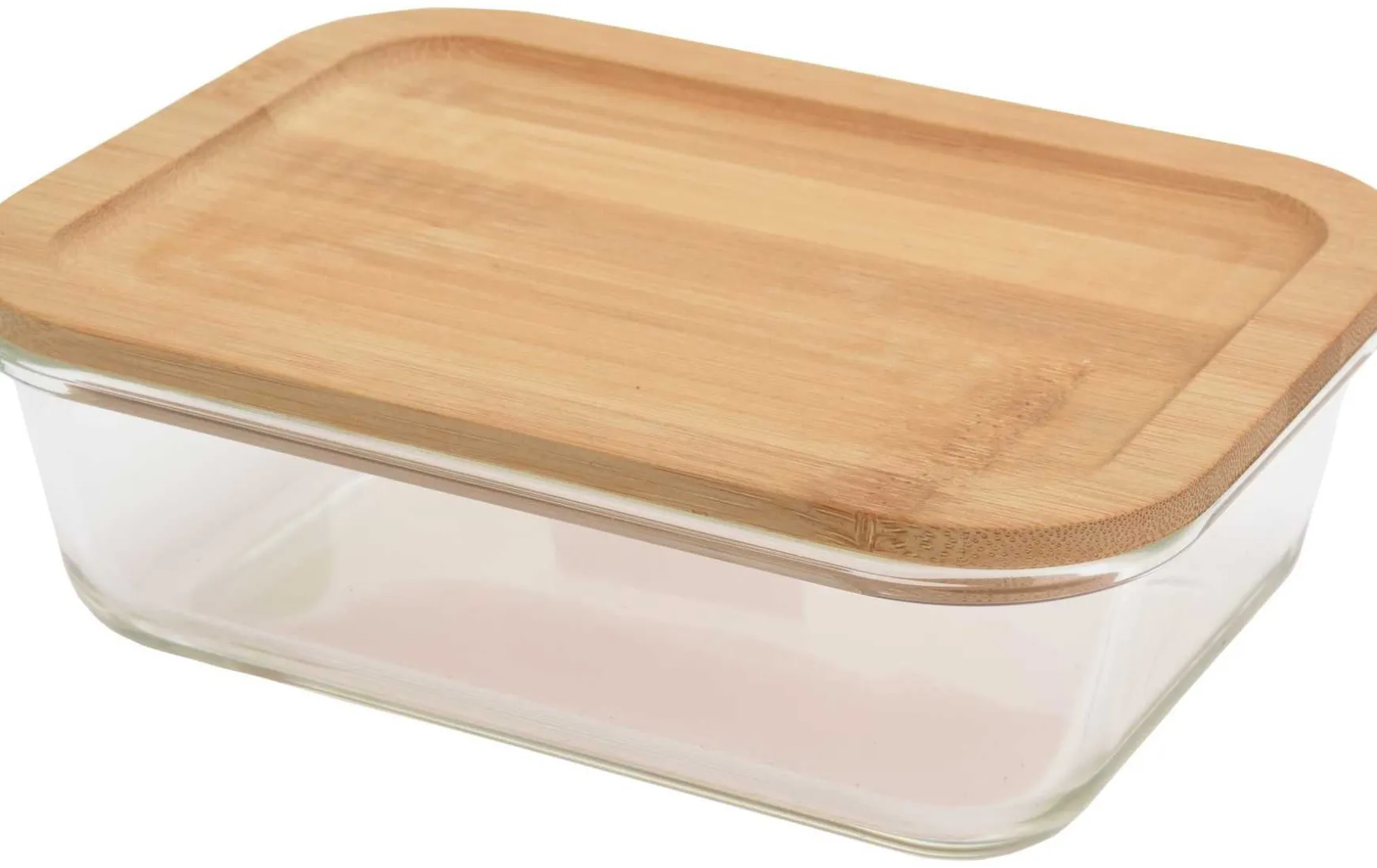 Umweltfreundlicher Lebensmittelbehälter aus Borosilikatglas mit Bambusdeckel. Borosilikatglas ist hochgradig temperaturwechselbeständig, weist eine geringe Kratzfestigkeit auf und läuft nicht an. Der Deckel des Behälters besteht aus Bambusholz und ist mit einer Gummidichtung ausgestattet.