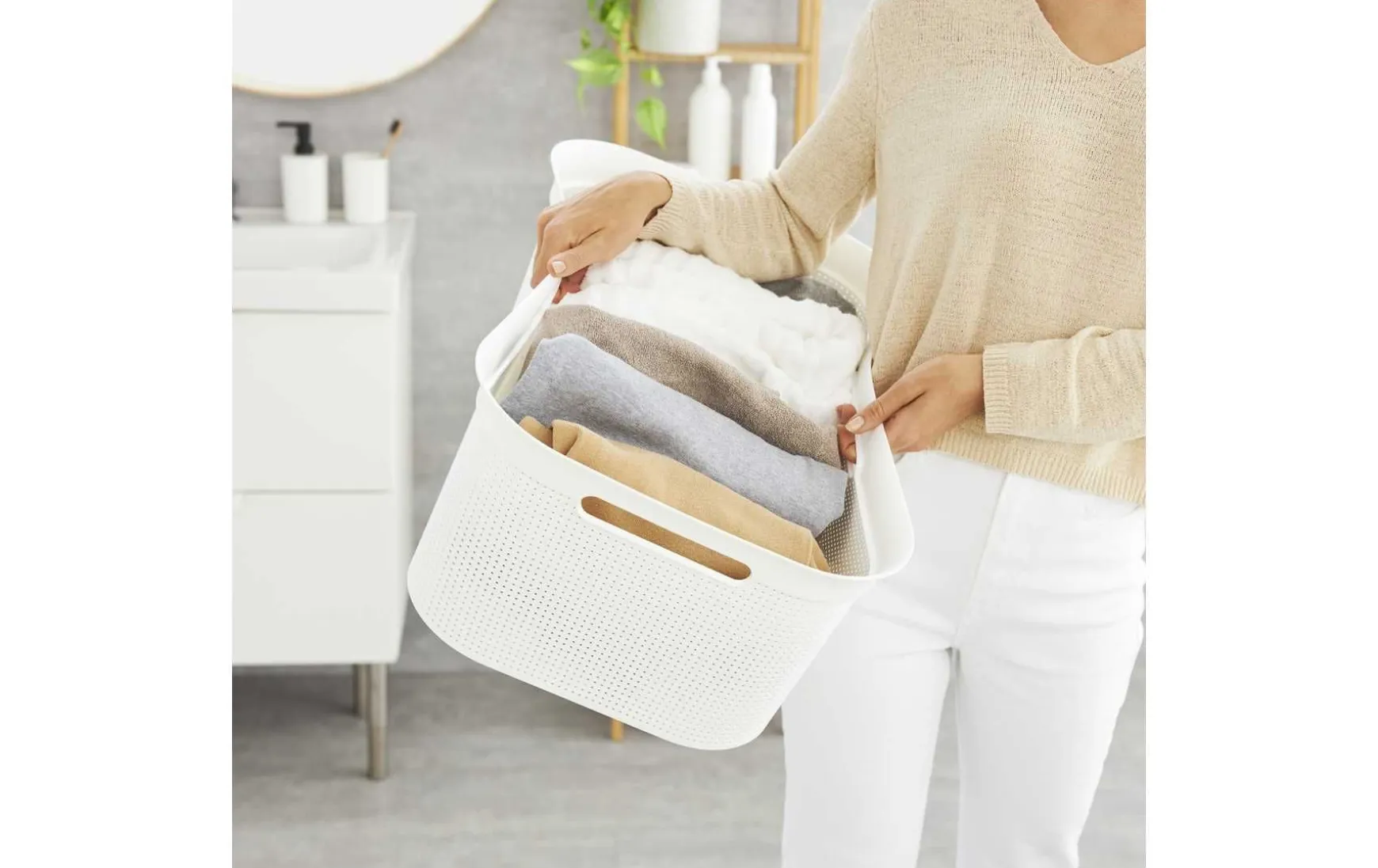 Dieser Wäschekorb eignet sich sehr gut, um Ihre Wäsche darin aufzubewahren. Ob dies nun die Dreckwäsche ist, die bis zum Waschen, oder die saubere Wäsche, die bis zum Bügeln darin aufbewahrt wird, spielt keine Rolle. Durch das Design können Sie den Korb für die Wäsche beispielsweise auch im Bad aufstellen. Die verschiedenen Farben, die Ihnen zur Auswahl stehen, ermöglichen, dass Sie hier ein spezielles System entwickeln können. So kann für jedes Familienmitglied zum Beispiel eine eigene Farbe stehen, aber auch für Hosen oder Pullover. Die integrierten Griffe sorgen dafür, dass der Wäschekorb auch in schwerem Zustand sehr gut getragen werden kann.