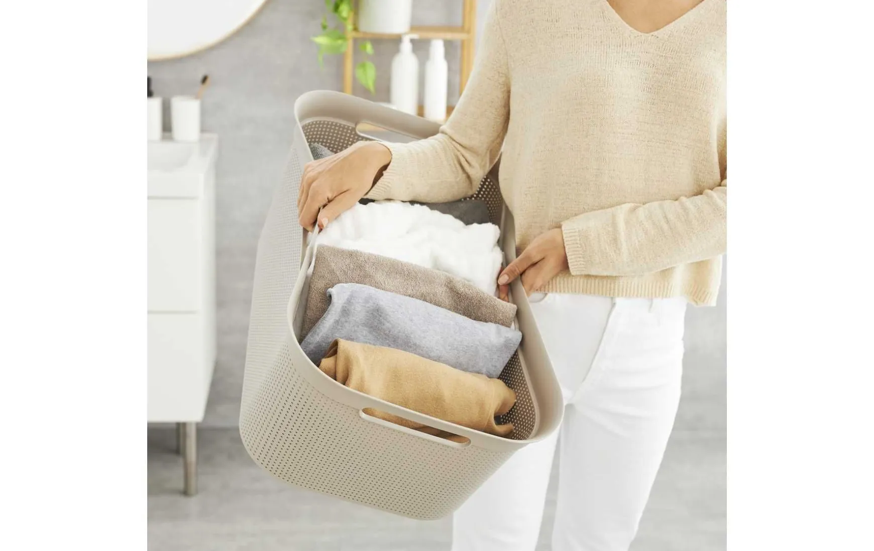 Dieser Wäschekorb eignet sich sehr gut, um Ihre Wäsche darin aufzubewahren. Ob dies nun die Dreckwäsche ist, die bis zum Waschen, oder die saubere Wäsche, die bis zum Bügeln darin aufbewahrt wird, spielt keine Rolle. Durch das Design können Sie den Korb für die Wäsche beispielsweise auch im Bad aufstellen. Die verschiedenen Farben, die Ihnen zur Auswahl stehen, ermöglichen, dass Sie hier ein spezielles System entwickeln können. So kann für jedes Familienmitglied zum Beispiel eine eigene Farbe stehen, aber auch für Hosen oder Pullover. Die integrierten Griffe sorgen dafür, dass der Wäschekorb auch in schwerem Zustand sehr gut getragen werden kann.