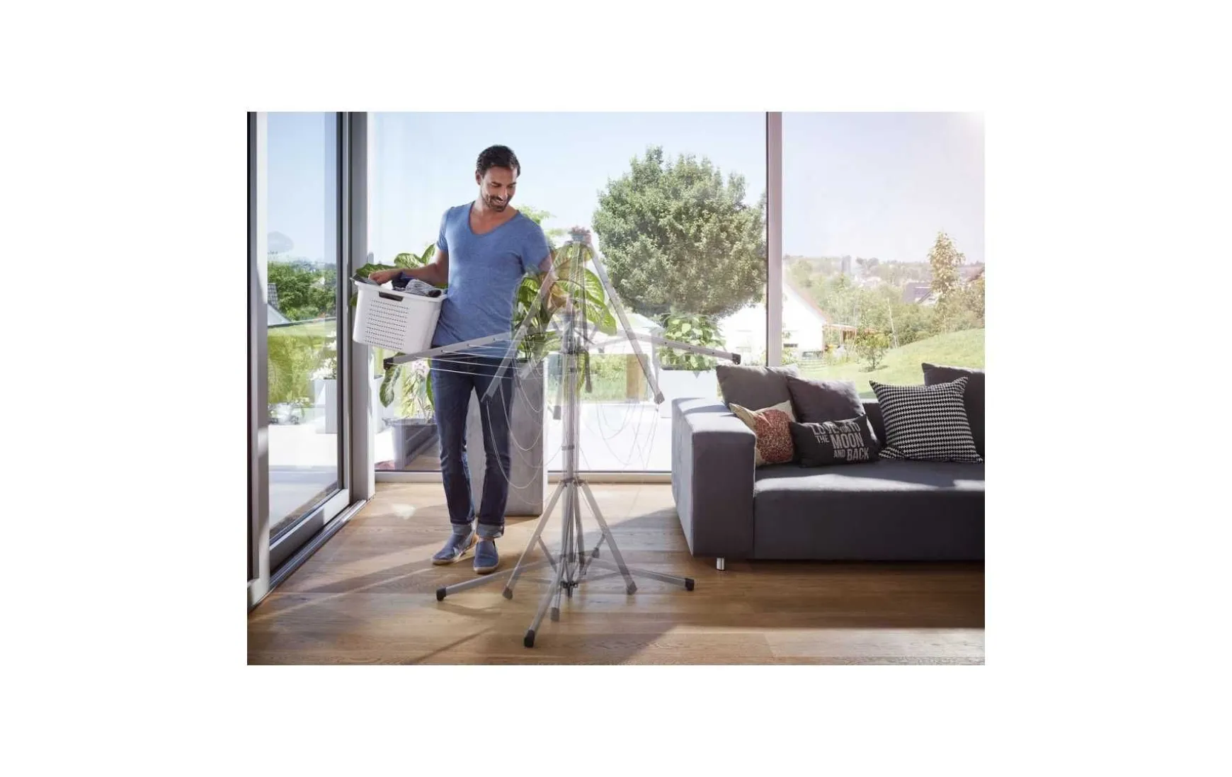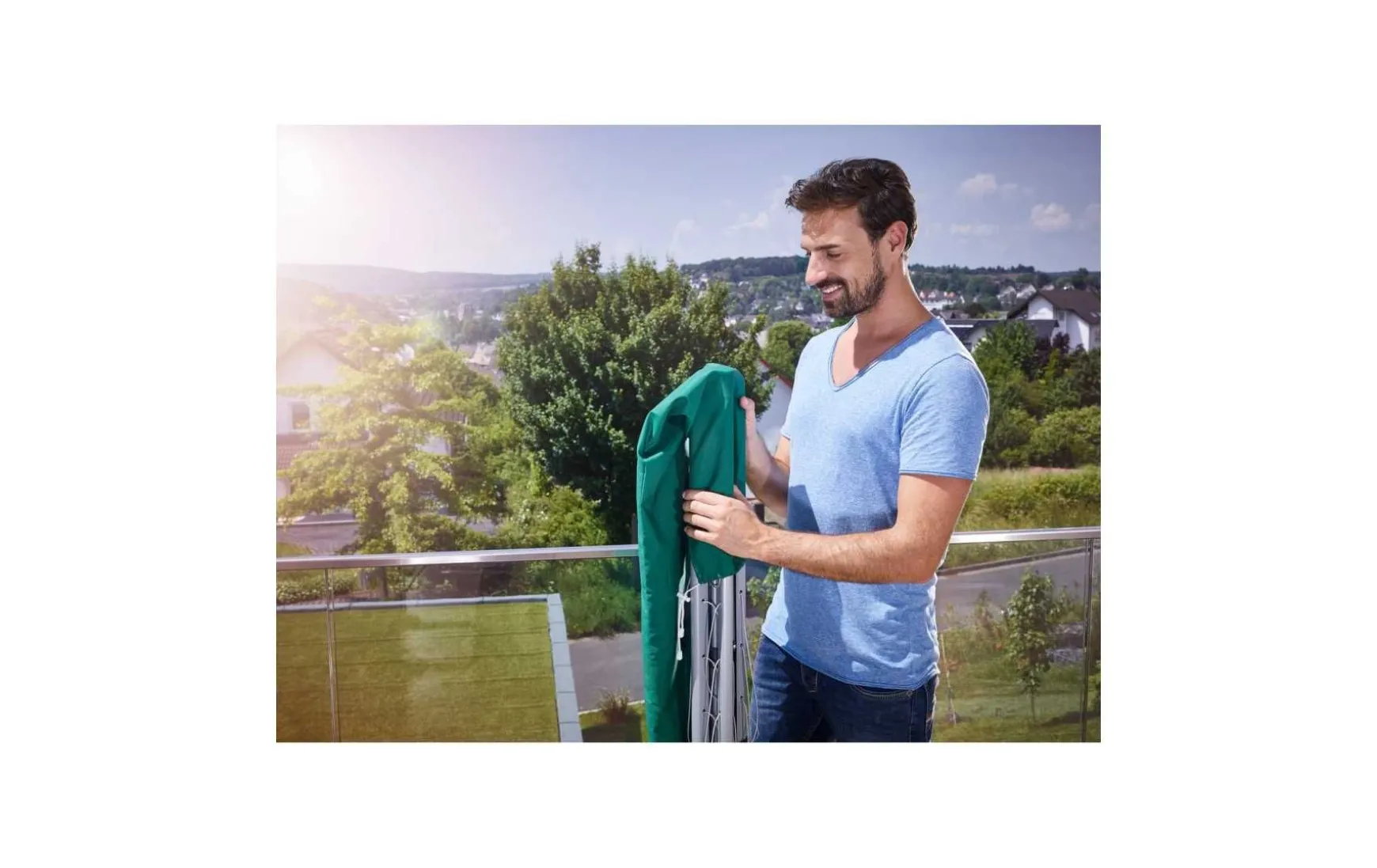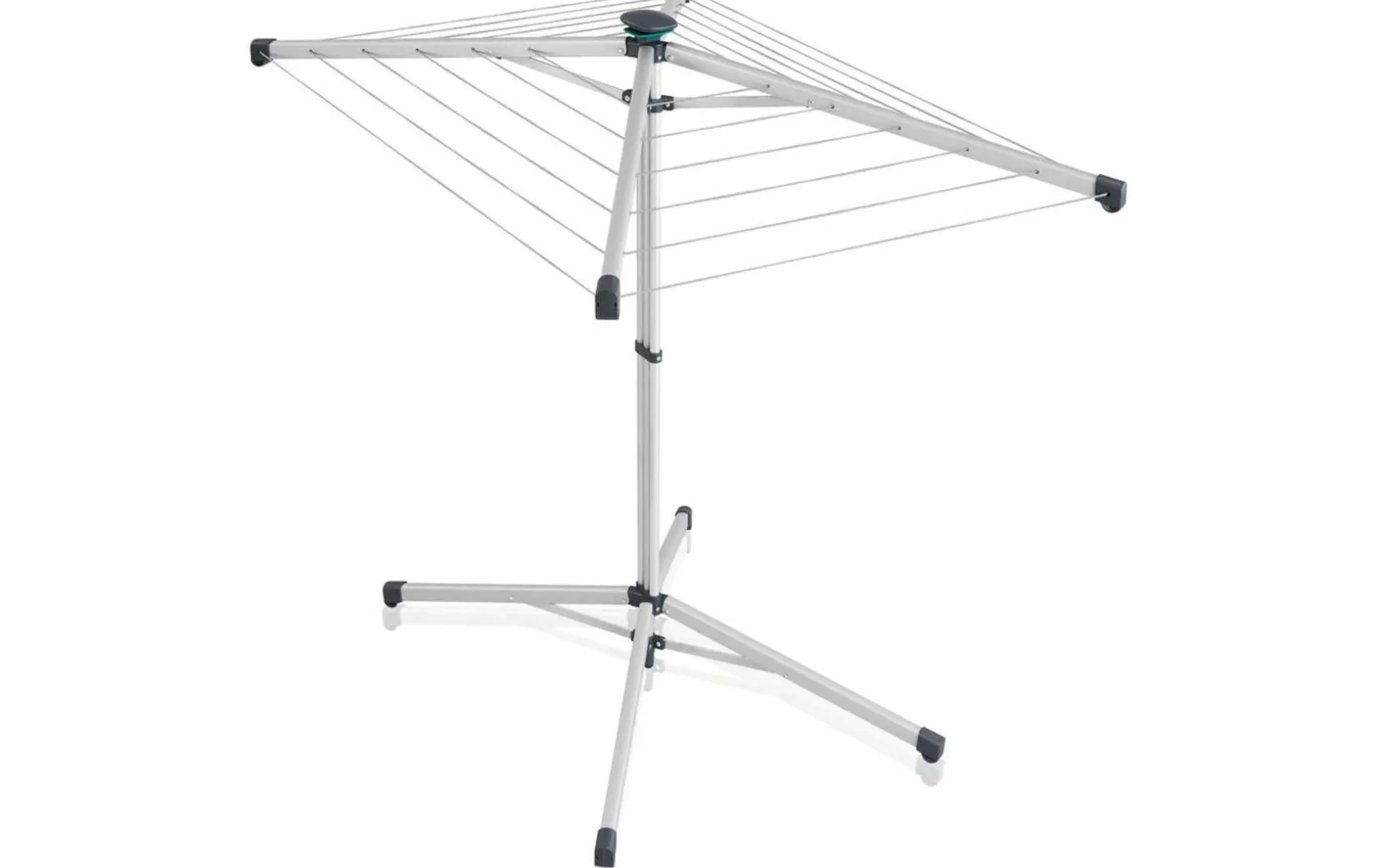 Praktische Standwäschespinne mit 14m Leinenlänge. Darauf findet mehr als eine Waschmaschinenladung Platz. Die äußersten Leinen sind bis zu 110cm lang und 95cm hoch, daher ideal für lange Wäschestücke. Zu den größten Vorteilen der Wäschespinne gehört die einfache Bedienung mit einer Hand auf Knopfdruck. Dank der breiten Basis und den robusten Armen steht die Standwäschespinne auch vollbeladen sicher. Sie ist gegen Witterungseinflüsse beständig und kann sowie innen als auch außen verwendet werden. Sie ist platzsparend, und somit nicht nur für kleinere Wohnungen und enge Balkone, sondern auch als der perfekte Begleiter für Ihren nächsten Campingurlaub geeignet. Dabei ist auch das geringe Gewicht von ca. 3,6 kg wichtig. Die Abmessungen der Wäschespinne im zusammengelegten Zustand betragen lediglich 147x9x12cm, außerdem wird sie inklusive Schutzhülle geliefert, die die Leinen sauber hält und den Transport erleichtert.