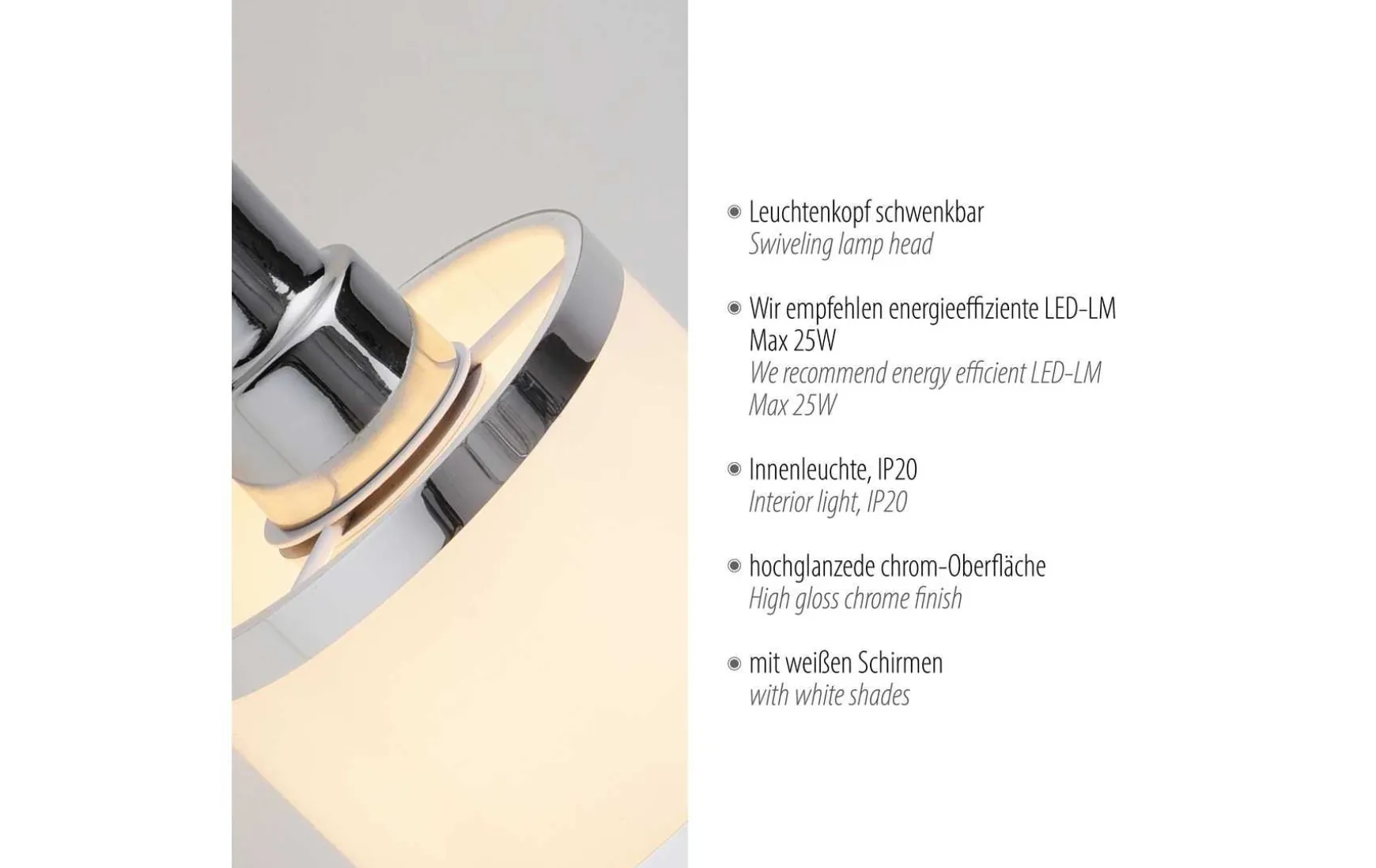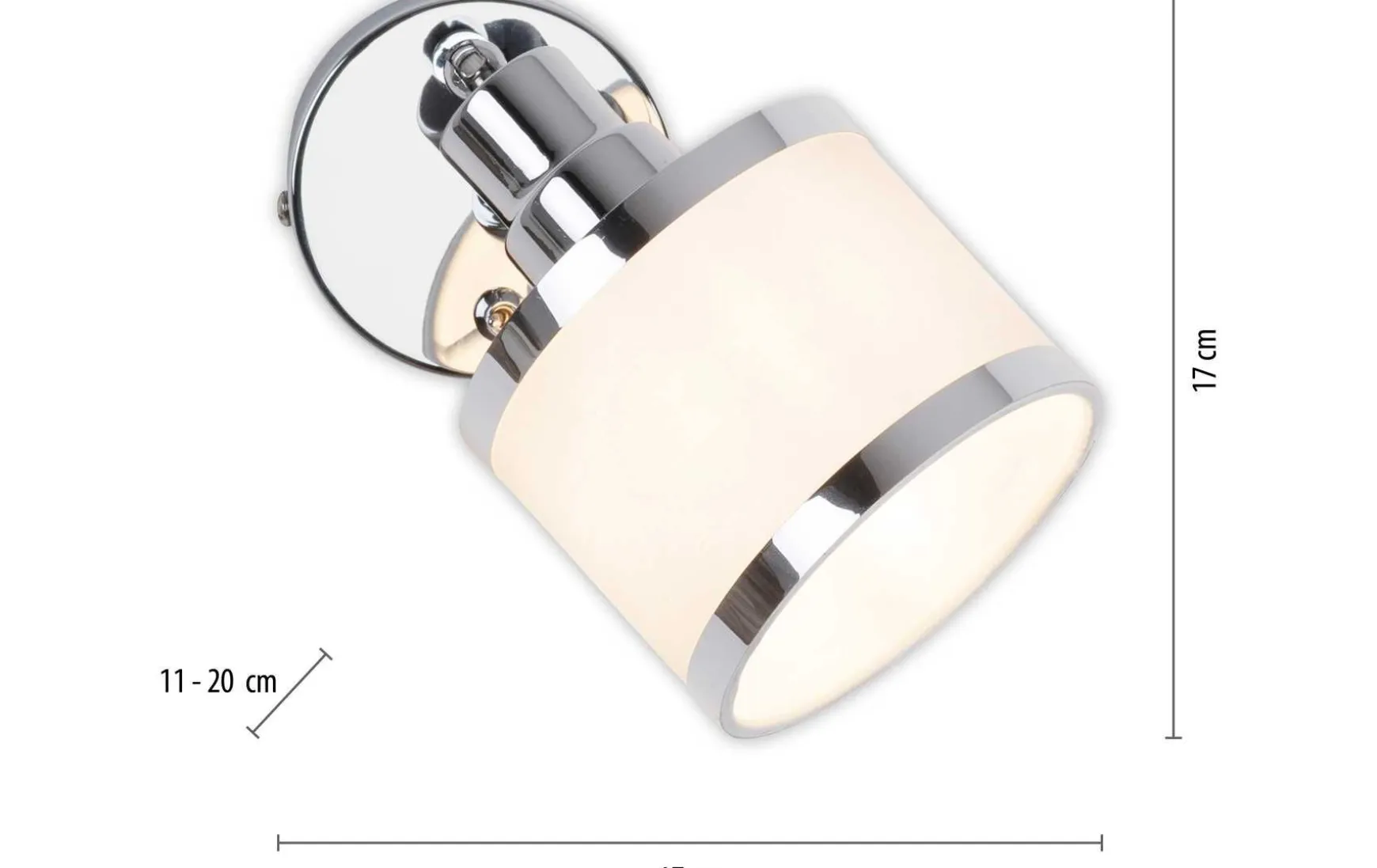 Der Wand- und Deckenspot wird mit einer glänzenden Chromoberfläche und dem Lampenschirm gekonnt in Szene gesetzt. Der kleine Spot ist dreh- und schwenkbar und kann so ganz nach Belieben ausgerichtet werden. Gewünschte Punkte in den Wohnräumen werden dadurch perfekt ins Licht gebracht. Per Kippschalter ist die Wandleuchte bequem zu bedienen. Ein Leuchtmittel ist nicht im Lieferumfang enthalten.Die Leuchte kann man einem E14-Leuchtmittel bis max. 25 Watt ganz nach Ihrer Wahl bestückt werden. Ideal ist eine Verwendung eines LED-Leuchtmittels. Die Spotleuchte ist vielseitig einsetzbar und wird schnell einen geeigneten Platz in Ihren Wohnräumen finden.