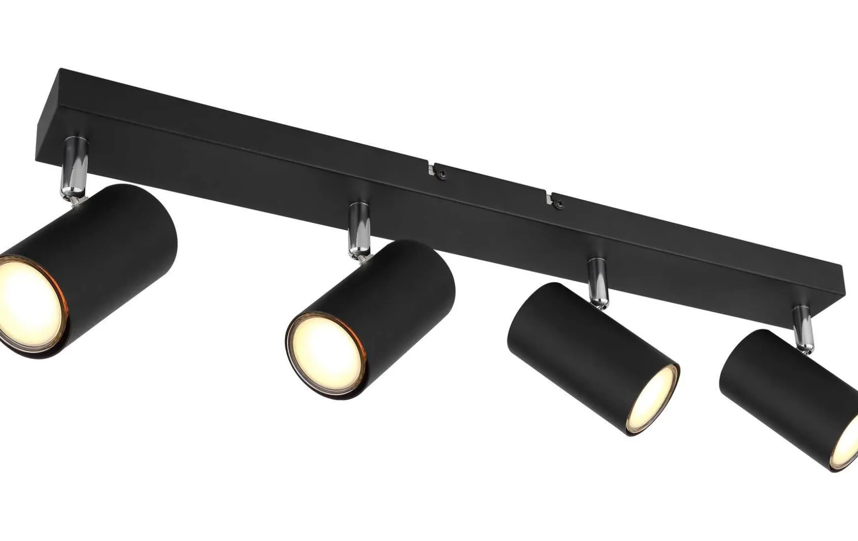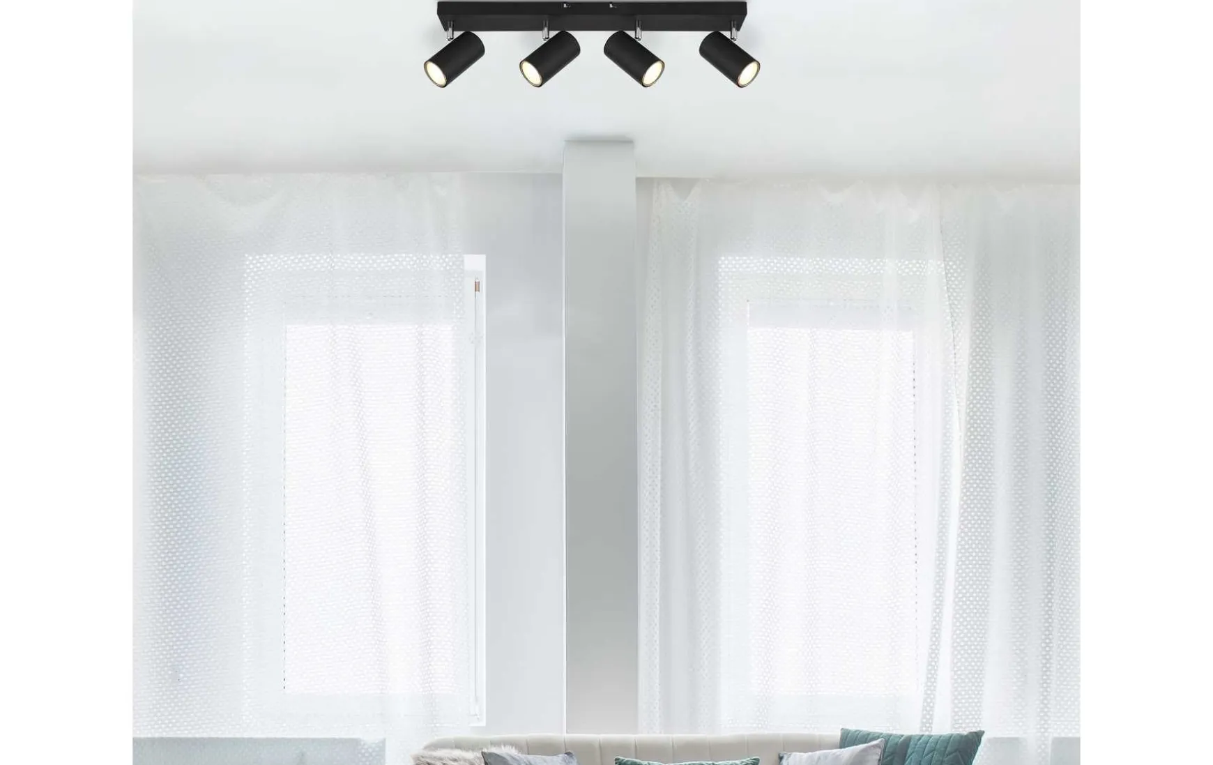 Dieser schlichte Strahler begeistert durch Design und Farbgebung. An einer schwarzen rechteckigen Deckenhalterung (56x6cm) befinden sich vier GU10 Fassungen, bedeckt von jeweils einem zylinderförmigen Schirm in matten Schwarz. Die GU10 Fassung, ermöglicht Ihnen die freie Wahl an Leuchtmitteln, bis zu einer maximalen Leistung von 35 Watt.