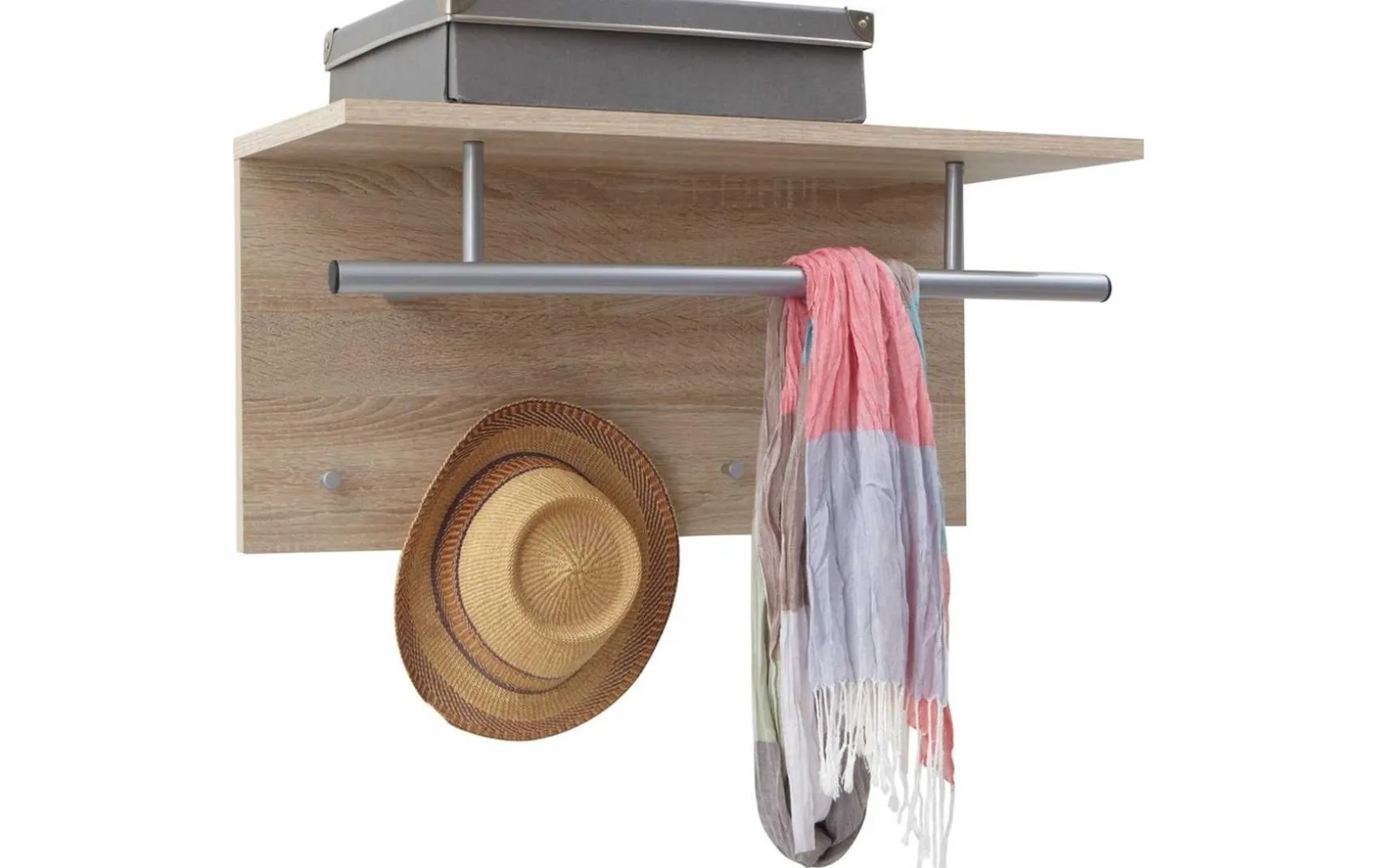 Die moderne Wandgarderobe überzeugt durch funktionales Design und pflegeleichte Oberflächen in Eiche-Optik. Ausgestattet mit vier stabilen Haken, einer Kleiderstange und einer praktischen Hutablage bietet sie ausreichend Platz für Jacken, Mäntel und Accessoires. Dank der hängenden Montage bleibt der Boden frei und der Flur wirkt aufgeräumt. Die melaminbeschichtete MDF-Oberfläche ist langlebig und leicht zu reinigen. Inklusive Montagematerial, zerlegt geliefert und in weiteren Farbvarianten erhältlich.